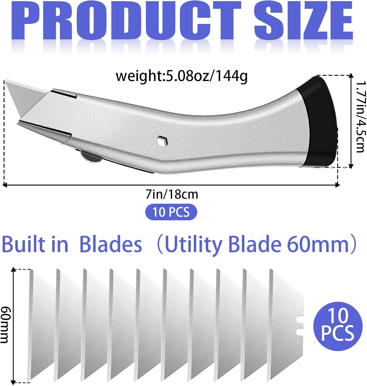 Features: Experience effortless handling with this set of 10 heavy-duty utility knives, engineered for every task you undertake. The safety screw-lock system ensures blades remain secure, providing precision and reliability for professionals and DIY enthusiasts alike. A versatile tool ideal for roofers, carpenters, and DIY enthusiasts, this lightweight box cutter handles roofing, drywall, vinyl, and carpet cutting with ease. Suitable for construction, gardening, or kitchen tasks, it's designed to make your projects more efficient. Specifications: Material: aluminum and steel Color: Sliver Size: as picture shown Package includes: 10 x Sliver Fixed Blade Roofing Knife Notes: Manual measurement, please allow slight errors on size. The color may exist a slight difference due to different screen displays. Pointed items are included, please be careful when using and please keep them away from kids
