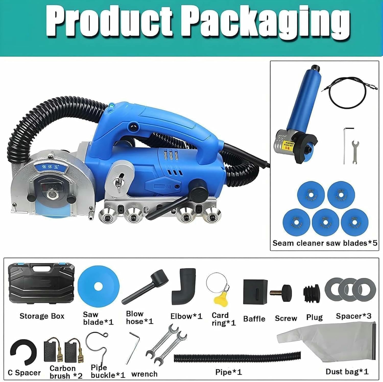 SpecificationProduct name: Ceramic tile seam cleaning machineRated power: 1200WSpeed:9000r/min Weight:3.4KG1.7 Seam clearing piece: 100*20*1.7mm2.2 Seam clearing piece: 100*20*2.2mm2.7 Seam clearing piece: 100*20*2.7mmSaw blade size: outer diameter 100mm, inner diameter 20mm1.7 Scope of application of seam clearing sheet: clearing 2-2.5mm seams2.2 Scope of application of seam clearing sheet: clearing 2.5-3mm seams2.7 Scope of application of seam clearing sheet: clearing seams of 3mm and abovePackage list:Host*1Note:1. Before turning on the machine, push and pull the machine forward and backward to ensure that all cutting discs and wheels are in the tile joints and that they can be pushed and pulled smoothly without obstruction.2. During operation, press the machine down slightly to ensure that the wheels do not come out of the tile joints.3. After the power is turned off, do not move the machine until it stops rotating.