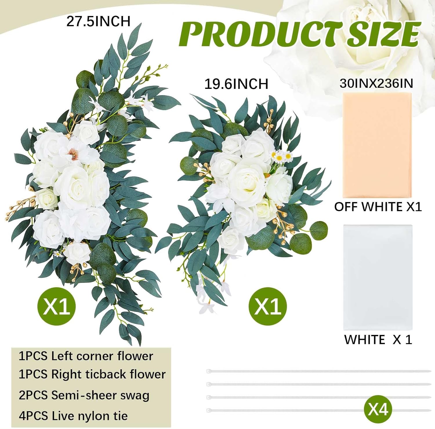 Features: Wedding arch decorations offers a comprehensive solution for your wedding arch decoration. It's the nice enhancement for any wedding occasion, whether outdoor or indoor. Besides weddings, the uses of drape fabrics can also decorate stair railings, tables, curtains and other elements of home decor, adding elegance to any setting. Specifications: Material: polyester cloth, chiffon Color: white and green Size: Main flower: 27.6 inches/ 70 cm Secondary flower: 19.7 inches/ 50 cm Drape fabrics: 29.5 x 236.2 inches/ 75 x 600 cm Package includes: 1 x Main flower 1 x Secondary flower 1 x Drape fabrics 1 x Cable ties Notes: Manual measurement, please allow slight errors on size. The color may exist a slight difference due to different screen displays.