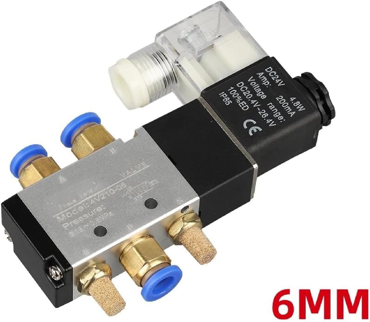 This versatile 4V210-08 pneumatic electric solenoid valve combines dual control functionality with precision engineering for reliable fluid control applications. Operating on 24V DC power with a voltage range of 20.4V-26.4V, this 5-way 2-position valve features an efficient 4.8W magnetic system that draws just 200mA. The robust construction includes brass fittings with convenient push-to-connect blue connectors for quick, secure pneumatic line installation. The valve body integrates both manual and electric actuation options, making it ideal for automated systems while maintaining manual override capability. With an IP65 protection rating, this valve stands up to demanding industrial environments while controlling air or gas flow with consistent precision. The compact design and standardized mounting pattern allow for easy integration into new or existing systems. Multiple ports enable complex flow control sequences, while the solenoid's clear housing allows for visual operation confirmation.