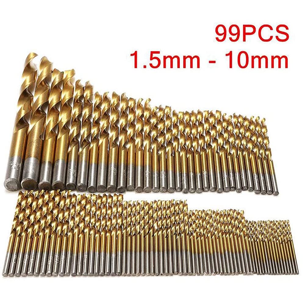 Material: High Speed Steel.Surface : Coated.You'll never be short of the right drill bit with the 99 Piece Drill Bit Set.Made from coated steel, the drill bits deliver a smooth, fast drilling action with low friction.Suitable for use on a wide variety of materials including alloy steel up to 900 N, iron, non-alloy steel up to 900 N, copper, bronze, cast iron, hard plastics and Perspex.Containing sizes: 1.5mm, 2.0mm, 2.5mm, 3.0mm, 3.2mm, 3.5mm, 4.0mm, 4.5mm, 5.0mm, 5.5mm, 6.5mm, 8.0mm, 10.0mm99pc Drill Bit Set:Package Included:16 x 1.5mm Hss Drill Bits16 x 2mm Hss Drill Bits15 x 2.5mm Hss Drill Bits10 x 3mm Hss Drill Bits10 x 3.2mm Hss Drill Bits8 x 3.5mm Hss Drill Bits8 x 4mm Hss Drill Bits3 x 4.5mm Hss Drill Bits3 x 5mm Hss Drill Bits2 x 5.5mm Hss Drill Bits2 x 6mm Hss Drill Bits2 x 6.5mm Hss Drill Bits2 x 8mm Hss Drill Bits2 x 10mm Hss Drill Bits1x Black metal carry casefor home improvement projects and home maintenance and repair.