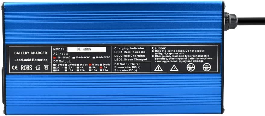 Specifications: AC Input: Standard 110-120V, 60Hz DC Voltage: 48 volts (Charging output is: 58.8V) DC Charge Rate: 6 amp Compatible battery: 48V 48Ah or less then 48Ah Automatic Charger featuring Trickle Charge Mode Plug Type: 3 Pin Round Charge Plug LED Status Lights