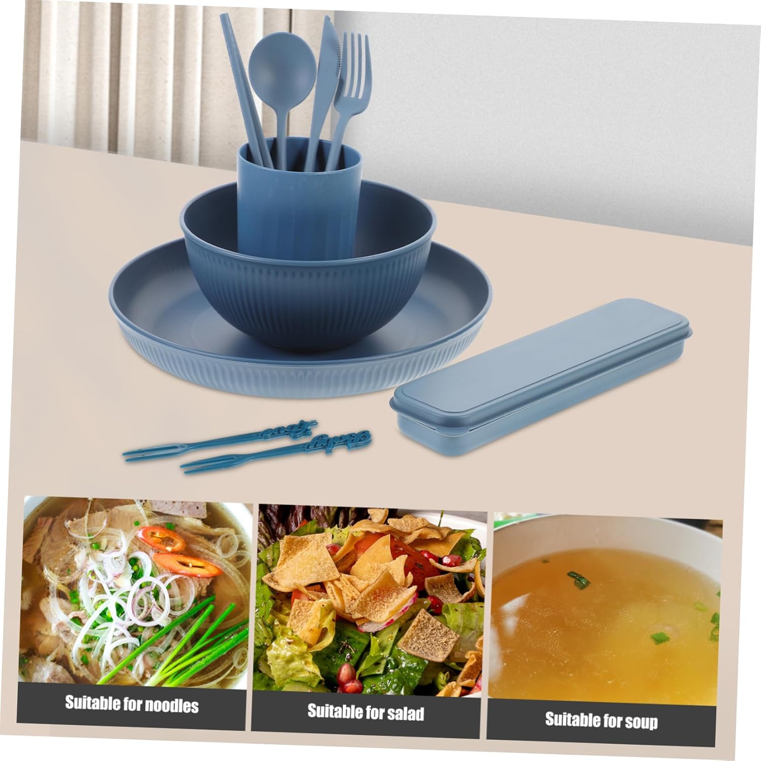 Package List 4 x bowls 4 x plates 4 x cups 4 x cutters 4 x forks 4 x spoons 4 x pair of chopsticks 8 x fruit picks 4 x storage boxes Characteristics - Size (box): 20x6x2cm/7.86x2.36x0.79in Reusable Utensils - Size (fruit ): 10cm/3.93in bowl - Size (bowl): 14.5x7.5cm/5.71x2.95in rice salad bowl - Size (cutter): 19cm/7.48in instant noodle bowl - Size (chopstick): 19cm/7.48in noodle bowl with chopsticks - Size (cup): 7x10.5cm/2.76x4.13in camping dishes utensils - Material:PP portable tableware - Size (plate): 22.50X22.50X3.00cm/8.84X8.84X1.18in noodle bowl with tableware - Size (fork): 18x2cm/7.09x0.79in Reusable Utensils With Case - Size (spoon): 17.5x4cm/6.89x1.57in lunch holder - You could send it to your friends and families as present, and they will and definitely love it Bowl Plate Dinnerware. - bowl for soups, rice, cereal bowls, and other foods that can also be used as pasta bowls. bowl with tableware - The storage case cutlery scratches and , and it makes them easy to carry and store compact bowl. - ColorDark Blue bento bowl - Reusable travel tableware is strong enough, easy to clean, can also be safely cleaned in a dishwasher Lunch Cutlery With Case.Goods Informationbento bowl These cutlery tool are easy to clean and maintain, will not damage your health.household ramen bowl This Tableware can be stored in the case, portable and compact, convenient for outdoor use.instant noodle bowl Do not hesitate to take them home, useful and excellent for you