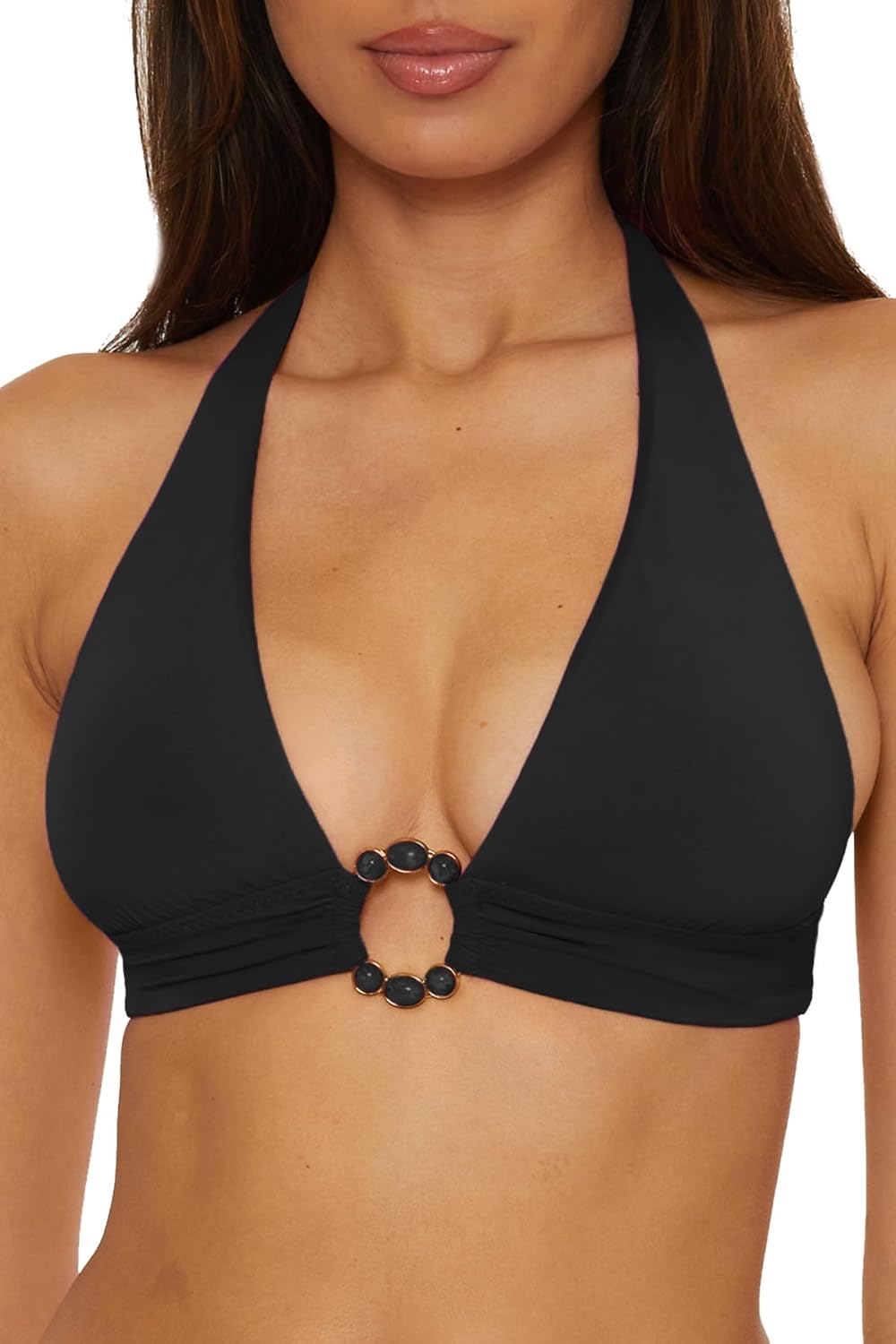 Add a touch of elegance to your swimwear collection with the BECCA Marble Canyon Women's Halter Bikini Top. Crafted from 83% Nylon and 17% Spandex, this top offers a comfortable and flexible fit for all your summer adventures. The gold ring with marbleized inlay stones at the center front adds a luxurious detail, while the adjustable soft ties at the neck and back provide a customizable fit. With removable soft cups for versatile bra support, this bikini top is perfect for women with big busts or those seeking extra comfort. Pair it with your favorite swimwear separates for a chic and stylish beachwear look this season.