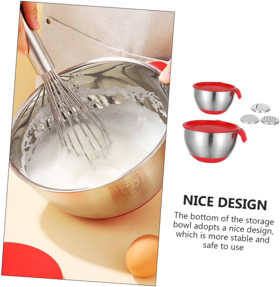 Package List 1 x mixing bowl(18cm) 1 x mixing bowl(20cm) 2 x covers 3 x graters Characteristics -Size:20.00X20.00X12.00cm/7.86X7.86X4.72in -Material:Stainless steel, silicone -Size:18.00X18.00X10.50cm/7.07X7.07X4.13in -Color:Assorted Color -Product Info:Stainless steel egg beating basin - The bowl is just the right size for fruits, salad, desserts and snacks, with workmanship and smooth surface. - The bowl is elegant and fashionable, suitable for dinner parties, parties and daily casual gatherings mixing bowl with handle. - The bowl with cover is made of stainless steel, silicone material, which is and practical for the lasting use. - Can be the perfect housewarming gift for your friends who will like this bowl. Strength and durability, can be used as baking mixing bowl and serving bowl multi purpose mixing bowl. - The bowl is simple , but it's practical to use, which will give you a fantastic use experience mixing bowl.Goods Informationmetal prep bowls You can store your all kinds of food, such as salad, noodle, fruit, rice, dessert, etc.cooking bowls Perfect housewarming gift for friends and co-workers, and they will like it.food prep bowls The convenient Salad Bowl is made of sturdy and material, not easy to break and deform, can serve you well