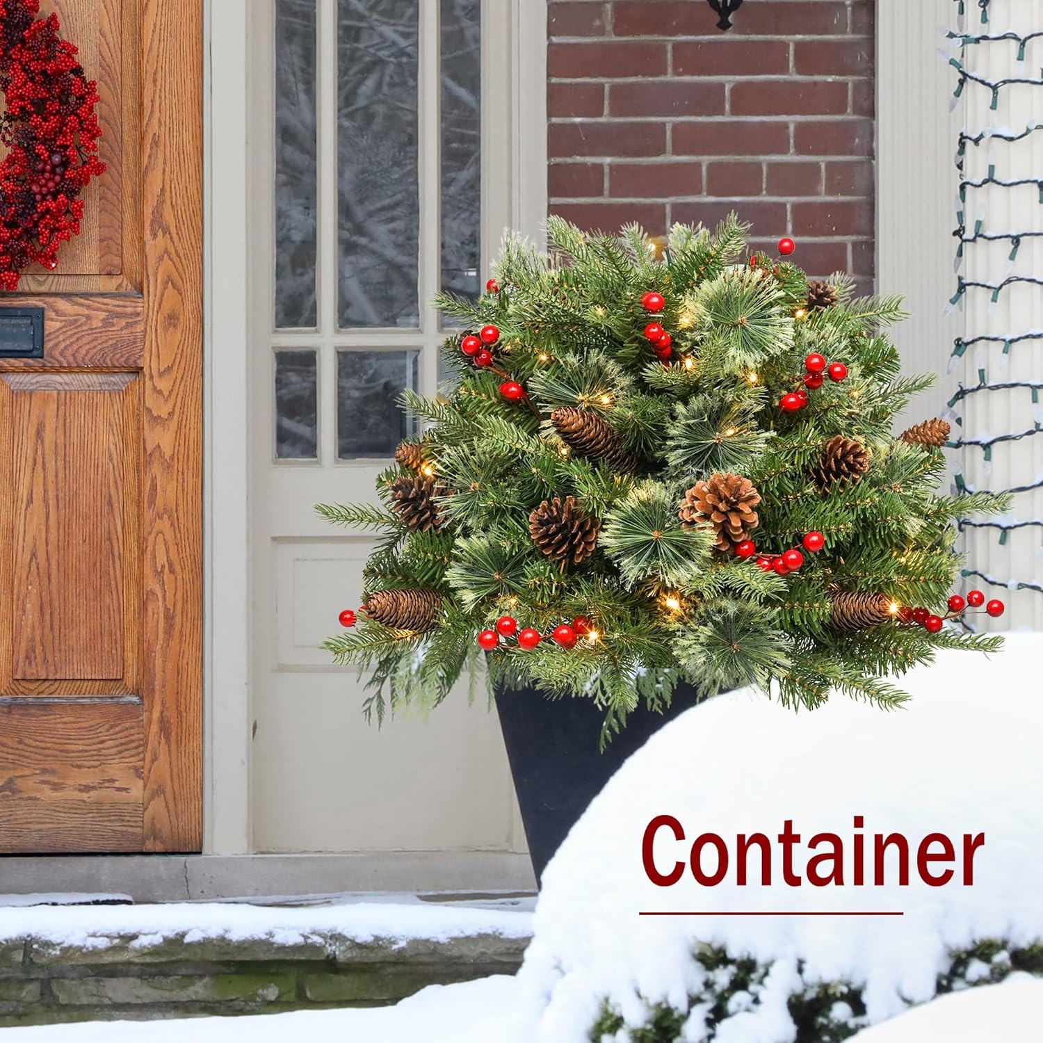 DurabilityCombining fine craftsmanship and years of experience, our holiday christmas urn filler decorations are constructed with sturdy, weather-resistant materials and designed to bring Christmas cheer for years to come.Fun For The Whole FamilyFamily and guests alike will marvel as you transform your home into a winter wonderland, capturing the beauty and charm of the holidays with our seasonal décor.Attention to DetailDesigned and decorated to feel lifelike, our Christmas collection features stunningly detailed Christmas decorations, from the snow-dusted branches of our flocked wreaths to the realistic pine cones and ornate ball ornaments that hang from our garlands.Package2 x Perlite christmas pot fillers2 x Tree StandFeatureEach Tree is pre-lit with 50 LEDsPowered by 3 AA BatteriesTimer: 6 hours on and 18 hours off