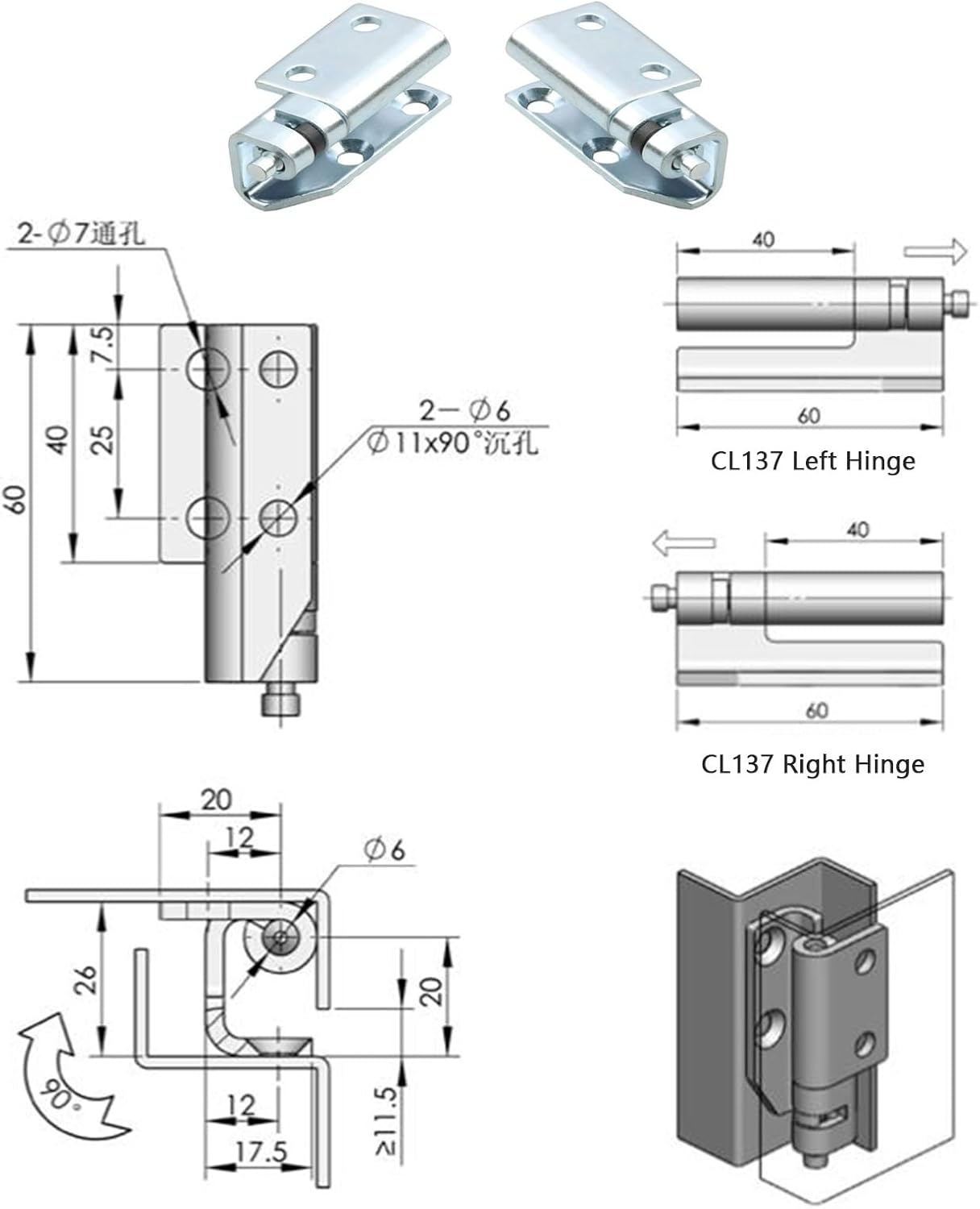 HingesParametersFeature DescriptionMaterial: carbon steelSurface treatment: white zinc platingStructure description: Can be opened at an angle of 135 °The package includes:1pc X hingeNote:Please allow 1mm errors due to manual measurement.Due to the difference between different monitors, the picture may not reflect the actual color of the item.