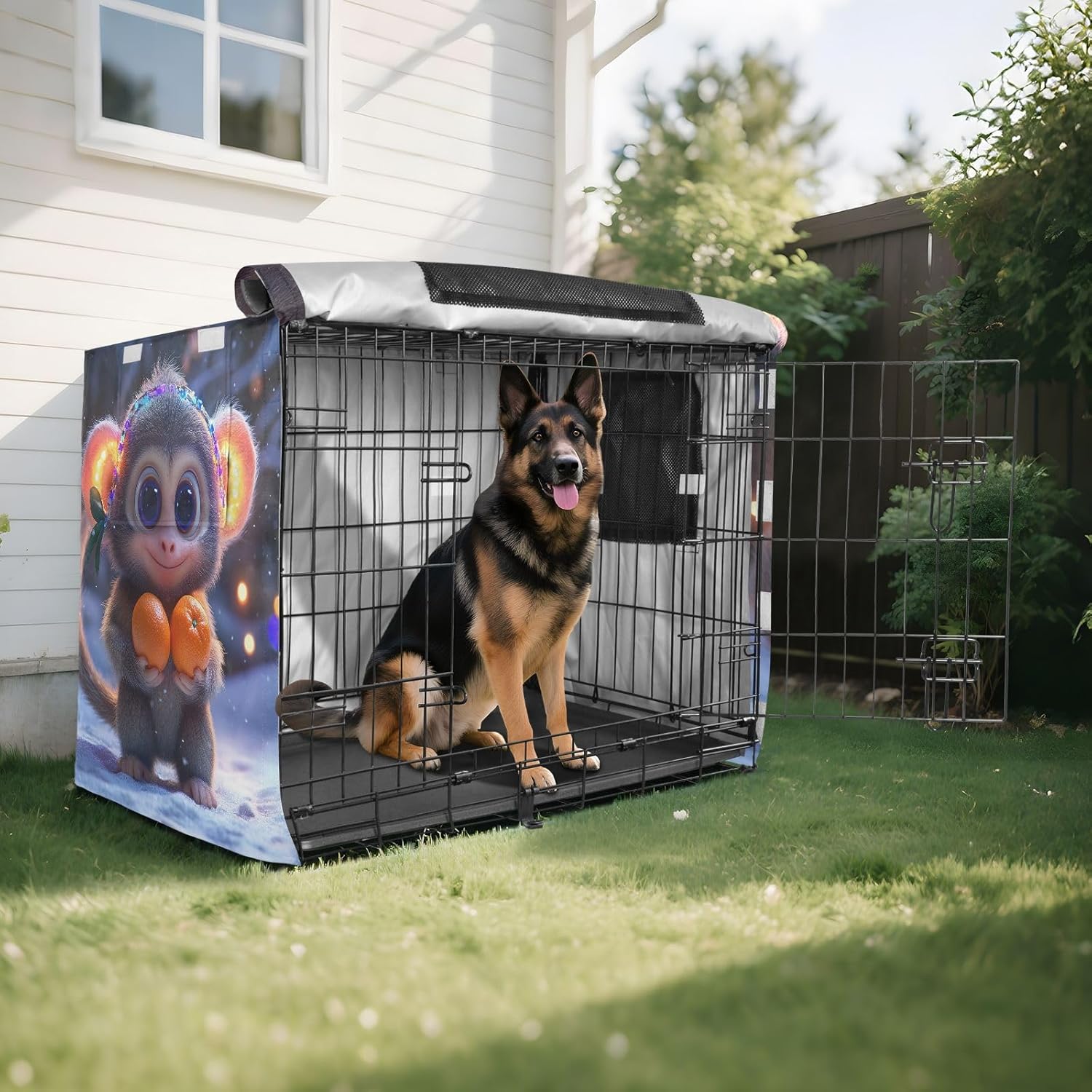 Protection – Made from 600D silver-coated oxford fabric, this pet cage cover provides reliable protection against weather conditions, including wind and rain. It prevents your dog from scratching the crate and blocks harmful UV rays.Easy Installation – This foldable crate cover features a user-friendly fastening system, allowing for quick installation without tools. It securely attaches to your dog crate, ensuring it stays in place for continuous protection.Effective Ventilation – Mesh windows on every side of the crate cover allow for steady airflow, keeping your dog comfortable and well-ventilated while inside. This design ensures your pet has a cool and breathable environment.Secure Fit – Equipped with four tie-down straps, the cover stays firmly in place, preventing it from shifting or being blown away. This added stability makes it suitable for outdoor use even in windy conditions.Ideal for Multiple Uses – This versatile water-resistant dog crate cover is Suitable for both indoor and travel use. Whether you’re at home, on a road trip, or camping, it offers a practical solution for protecting your pet’s crate.