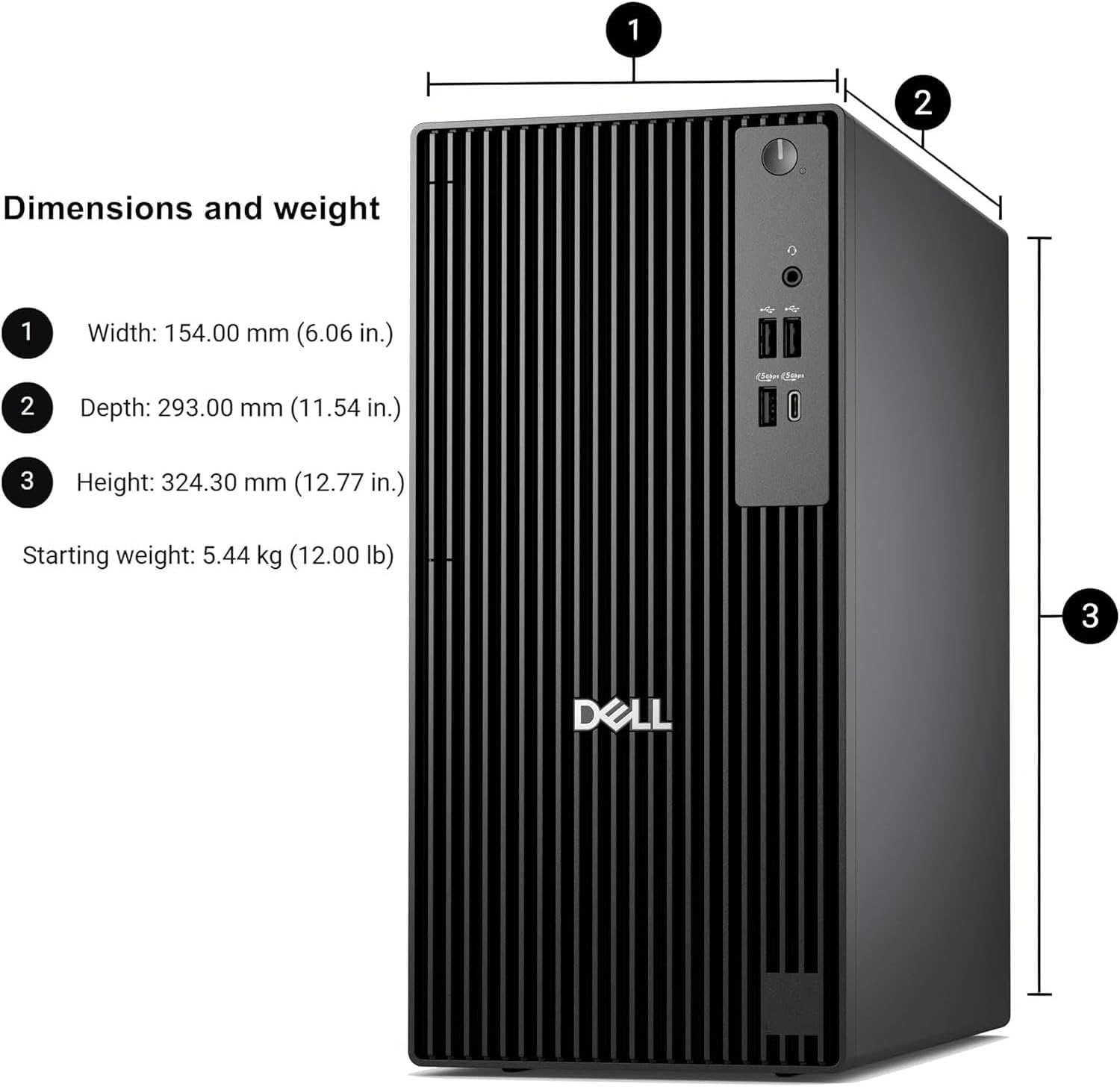 Processor: Intel 14th Gen i5-14500, 5GHz Processor ( 24MB Cache, 14-Cores, 20-Threads, 6 Performance-cores) Storage: Up To 4TB PCIe SSD (Solid State Drive) Memory: Up To 64GB DDR5 Memory Graphics: Integrated Graphics Integrated Graphics Operating System: Windows 11 Connectivity:, Ethernet LAN (RJ-45) Camera: No Webcam Input/Output:, Black, Dell Standard USB Keyboard, USB Mouse Ports/Slots:, 7 USB 3.0, 1 USB-C. 1 HDMI, 1 Display Port (DP), Headphone/Microphone Combo Jack Color: Black Form/Style: Desktop Product Dimensions (WxLxH): 12.76 IN x 6.06 IN x 11.53 IN Weight: 9.17lb