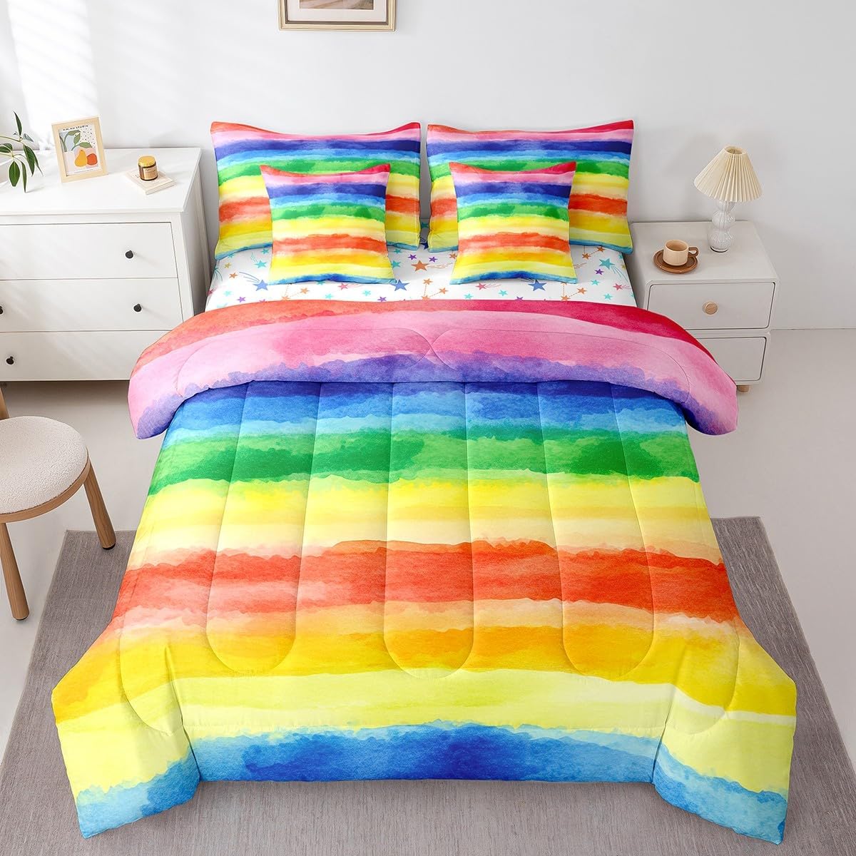 Colorful Makeover to Your Life Various size and color options, there are always decor room. Size Options: 7 Pieces Twin Size,1 Down Comforter 68"x 90", 1 Fitted Sheet 39"x75"x16", 1 Flat Sheet 96"x66", 2 Pillow Cases 30" x 20",2 Throw Pillow Covers,Covers Only. 18"x 18". 7 Pieces Full Size ,1 Down Comforter 79"x 90", 1 Fitted Sheet 54"x75"x16", 1 Flat Sheet 96"x81", 2 Pillow Cases 30" x 20",2 Throw Pillow Covers,Covers Only. 18"x 18". 7 Pieces Queen Size,1 Down Comforter 90"x 90", 1 Fitted Sheet 60"x80"x16", 1 Flat Sheet 102"x90", 2 Pillow Cases 30" x 20",2 Throw Pillow Covers,Covers Only. 18"x 18". 7 Pieces King Size,1 Down Comforter 104"x 90", 1 Fitted Sheet 78"x80"x16", 1 Flat Sheet 106"x90", 2 Pillow Cases 30" x 20",2 Throw Pillow Covers,Covers Only. 18"x 18". Decoration: For your mom, dad, sister, brother, grandma, wife, husband, and all other beloved with many surprising designs. You can find a design for everybody and every interest in our collection. Your Home,You Decide Different types of bedding sets could bring rooms in different styles. Also, rooms in different styles needs different types of bedding sets