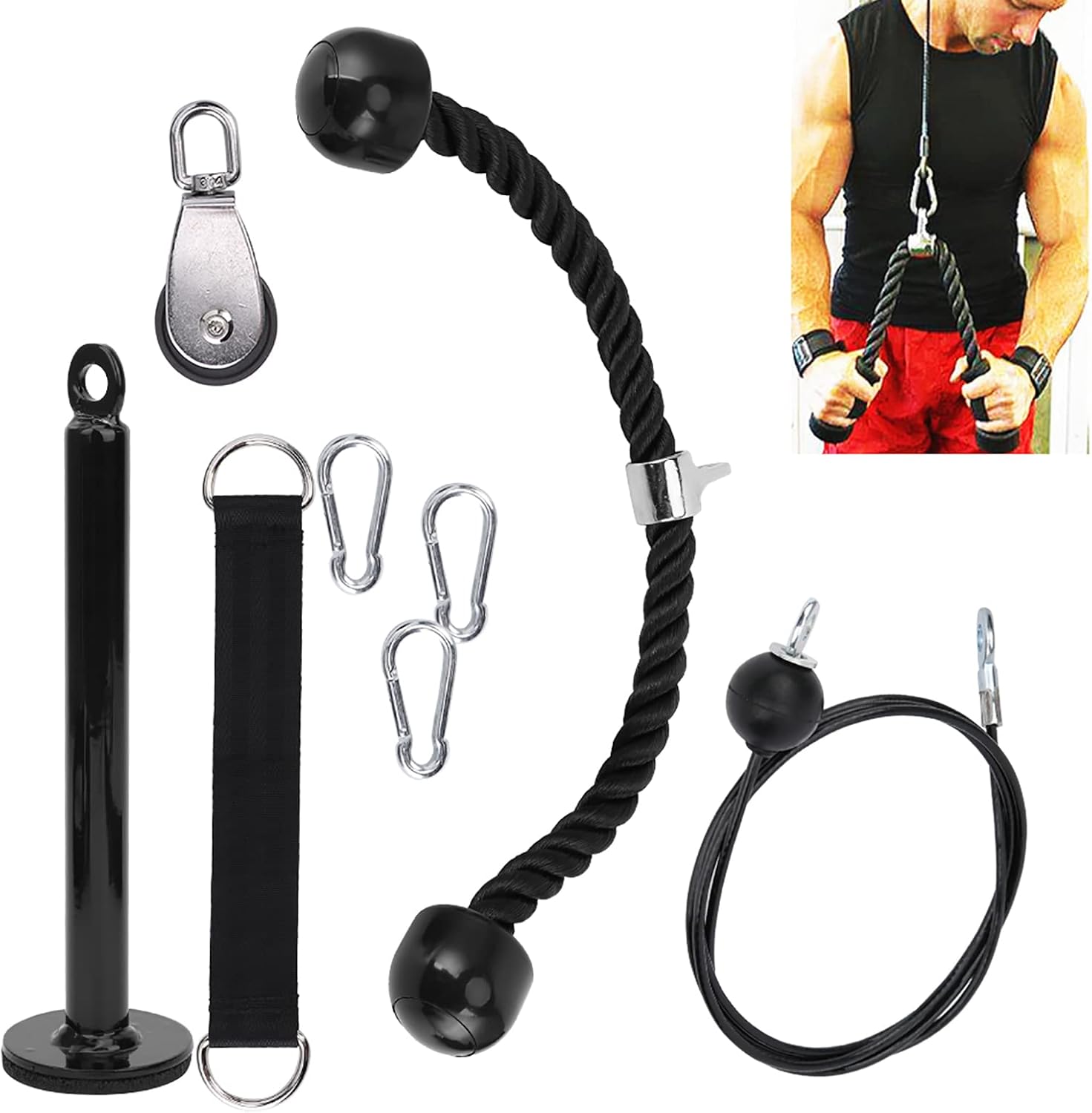 The F i t l e e 8-Piece Portable Pulley System delivers professional-grade training with its 60-degree rotating pulley that prevents rope twisting and ensures smooth operation. Featuring a 2-meter steel cable for versatile exercises and quiet nylon guides for undisturbed workouts, this system Focuses on arms, back, shoulders, and core muscles. The compact design makes it ideal for home gyms while providing comprehensive strength training capabilities.Specification:Condition: 100% Brand NewItem Type: Fitness EquipmentMaterial: Stainless SteelLoading Pin Length: 23 cm / 9.1 inSteel Rope Length: 2 m / 6.6 ftDouble End Pull Rope: 70 cm / 27.6 inTotal Weight: 1592 gPackage List:1 x Pulley3 x Connection Buckle1 x Double Layer Safety Belt1 x Steel Rope1 x Double End Pull Rope1 x Loading PinCondition: 100% brand newItem type: Fitness EquipmentMaterial: stainless steelColor: As picture shownLoading pin length: Approx. 23cm/9.1inLoading pin tube diameter: Approx. 2cm/0.8inSteel rope size: Approx. 2m/6.6ftDouble end pull rope size: Approx. 70cm/27.6inWeight: Approx. 1592g Package List:1 x Pulley3 x Connection buckle1 x Double layer safety belt1 x Steel rope1 x Double end pull rope1 x Loading pin