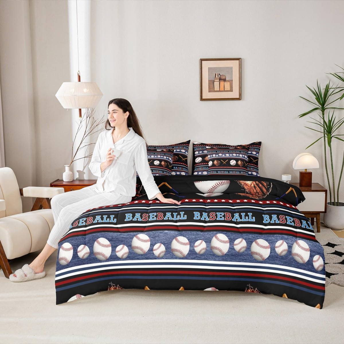 Why choose us Everyone has their own preferences; we develop different styles and different designs to suit the hobbies and aesthetics of different people; we look forward to bringing more joy and fun into your life; special design for special you; it's not just a simple home product, it's a way of life Brighten up your bedroom with this bed linen set; this bright and colourful bedding set features vibrant colours and special print pattern; turn the reversible duvet set over for a new look against a modern geometric background Convenient to use due to polyester which is super soft and comfortable; this all year round bedding is designed to be lightweight and breathable for a good night's sleep; a practical product for homes, dormitories, hotels, guest rooms Twin bedding set includes 1 twin comforter: 68"x90", 1 fitted sheet: 39"x75"x16", 1 flat sheet: 66"x96", 2 Pillowcases: 20"x30", 2 square pillow covers: 18"x18", perfect for a twin size bed. Full bedding set includes 1 full comforter: 79"x90", 1 fitted sheet: 54"x75"x16", 1 flat sheet: 81"x96", 2 Pillowcases: 20"x30", 2 square pillow covers: 18"x18", perfect for a full size bed. Queen bedding set includes 1 queen comforter: 90"x90", 1 fitted sheet: 60"x80"x16", 1 flat sheet: 90"x102", 2 Pillowcases: 20"x30", 2 square pillow covers: 18"x18", perfect for a queen size bed. King bedding set includes 1 king comforter: 104"x90", 1 fitted sheet: 78"x80"x16", 1 flat sheet: 90"x106", 2 Pillowcases: 20"x36", 2 square pillow covers: 18"x18", perfect for a king size bed. In addition to this comforter set with sheets, there are curtains, area rugs, shower curtains, blankets and other furniture with the same design waiting for you to explore. Whether it is for birthday of your family or friends, relatives, or just for yourself, the item should be interesting and authentic.