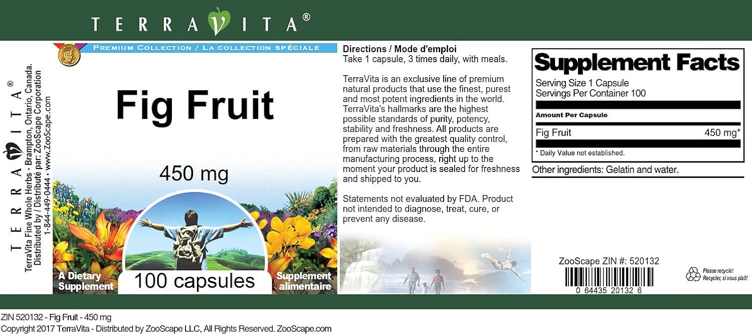 Fig Fruit - 450 mg (100 capsules, ZIN: 520132)Packaged in the United States in a GMP certified facility (Good Manufacturing Practice).No fillers.Manufacturer: TerraVitaSize: 100 capsulesEasy-to-swallow Capsules in a sealed bottle.Ingredients: Gelatin, Water, Fig Fruit - 450 mg