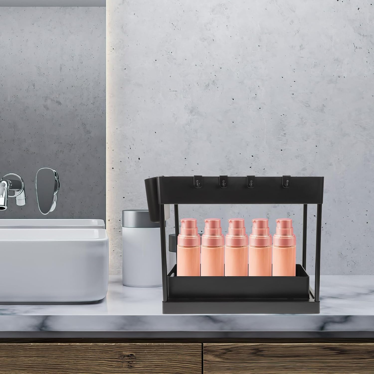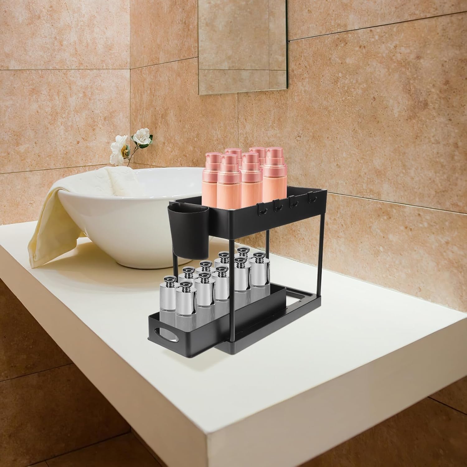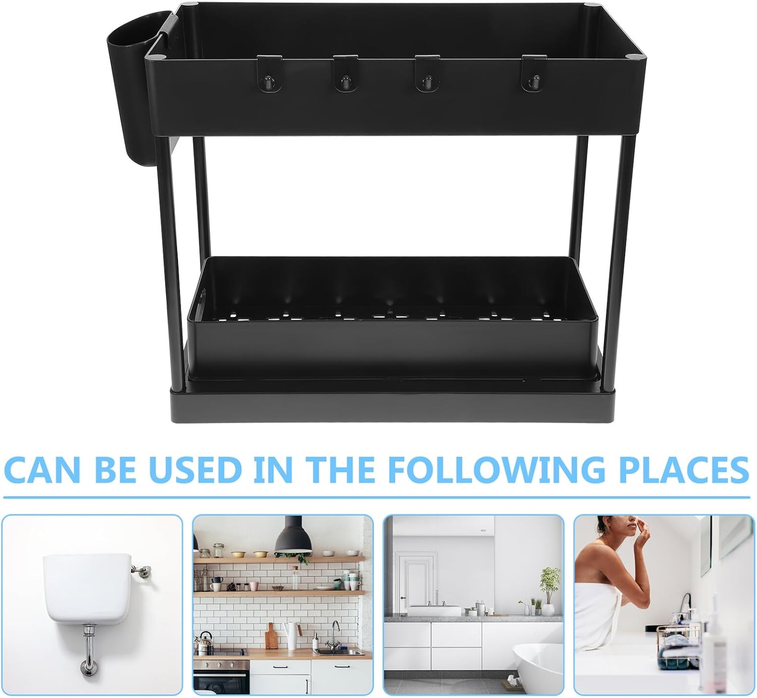Package List 1 x storage rack 4 x hooks 1 x storage bucket Characteristics -Color:Black -Size:39.50X30.00X20.00cm/15.52X11.79X7.86in -Product Info:Sliding drawer rack -Material:ABS - Made of high end ABS material, waterproof, not afraid of wet environment. - No need to install, just place it where you like, make the most of everything and save space kitchen storage organizer. - Make full use of the space wisely, bid farewell to clutter in an orderly way, and give you a clean and tidy environment Sink Sundries Storage Holder. - Large capacity, can be placed daily use of daily necessities, a nice helper under sink organiser. - With this storage shelf, it can bring much convenience to your life kitchen storage shelf.Goods Descriptionkitchen storage organizer A good helper to keep your house neat and organized.Sink Sundries Storage Holder It can store different tableware safely with enough space, also can be applied for bathroom storage.kitchen storage shelf Are you still worried about the kitchen utensils? This kitchen organizer will help you solve the problems