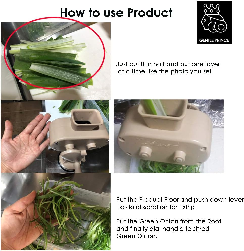 About Product You can easily shredder green onions by turning the roller. You can use it more easily if you see how to use the picture. Size: 15.5cm x 21cm x14cm Material: ABS/ Stainless Steel/Sola Product Specification Size: 15.5cm x 21cm x14cm Material: ABS/ Stainless Steel/Sola How to use Product Just cut it in half and put one layer at a time like the photo you sell Put the Product Floor and push down lever to do absorption for fixing. Put the Green Onion from the Root and finally dial handle to shred Green Oinon.