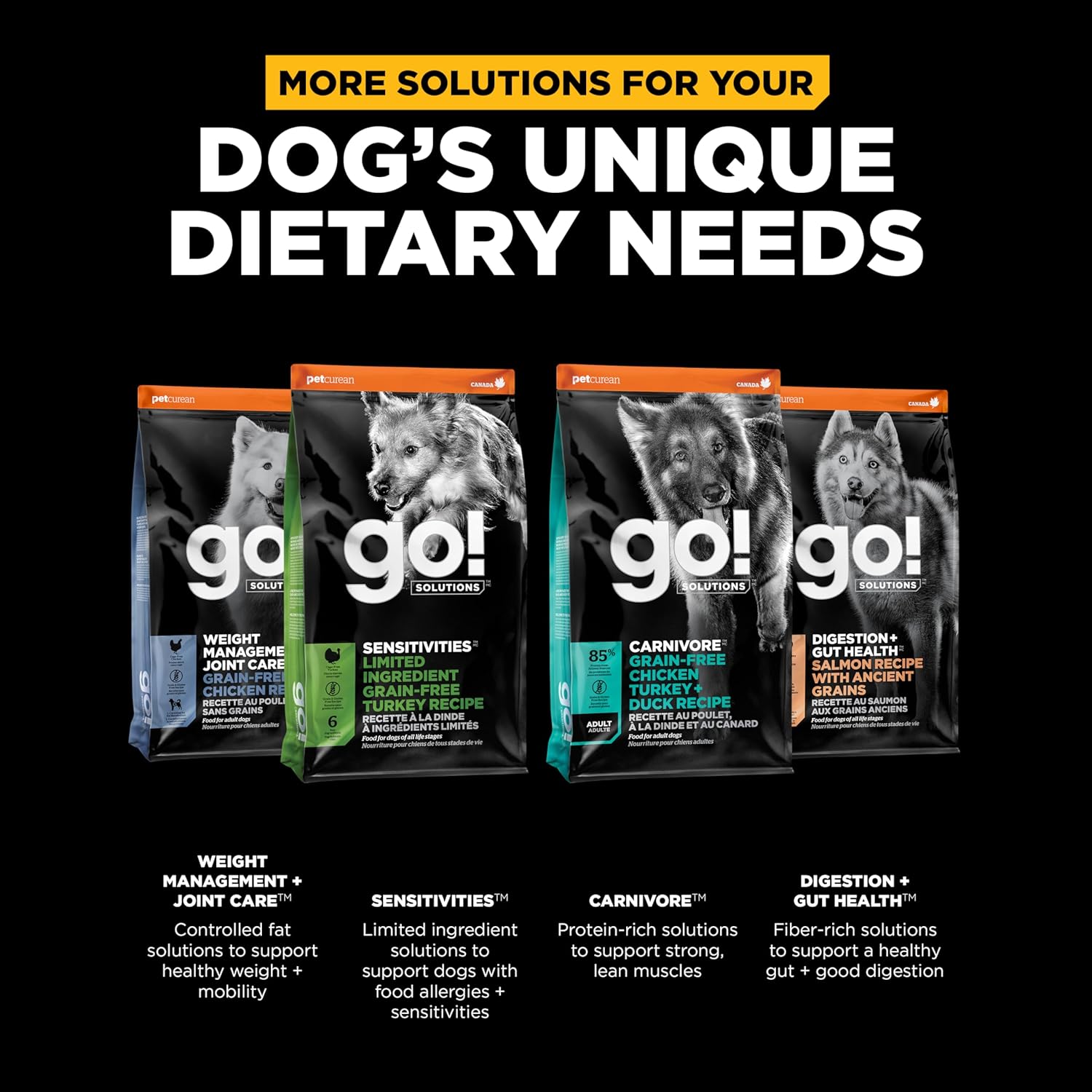 You've got pets? We do too, and we know that finding the right food for your cat or dog can be like walking blindfolded with the thought we all dread: "What if my pet reacts badly to it?" So our team of expert pet nutritionists put their knowledge and experience to work to solve the big question: what should we feed pets who need something other than just ordinary pet foods? And they came up with a solution. Several in fact, that we call GO! SOLUTIONS. They used only premium-quality ingredients carefully selected and balanced to provide simple solutions to support pets with all kinds of issues, from sensitive stomachs to skin + coat health. Finally. You can breathe easy knowing you’re feeding your best pal premium nutrition tailored to their unique dietary needs. Hallelujah!