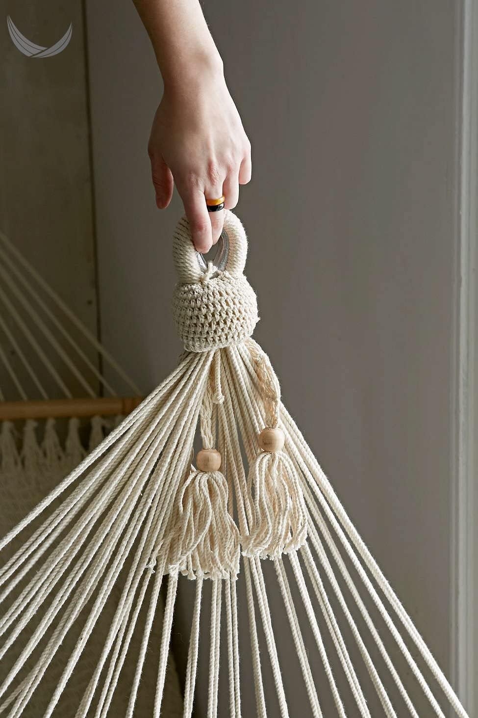 Enjoy ultimate relaxation with this handwoven Nicaraguan rope hammock, crafted from soft, high-quality cotton ropes and carefully double-stitched for enhanced durability and comfort. Each hammock is handmade by skilled artisans in Nicaragua and features wooden spreader bars made from sustainably sourced hardwood, adding both stability and a touch of tropical elegance. The breathable cotton material is Oeko-Tex Standard 100 certified, ensuring it meets strict safety and environmental standards. Measuring approximately 83 inches wide by 54 inches deep (7 feet by 4.5 feet), this hammock fits standard hammock stands and supports up to 265 pounds. The intricate double-stitch weaving technique prevents tangling, making it stronger and more durable than typical rope hammocks. The product’s wooden components display unique grain patterns and color variations, making each piece authentically individual. This hammock is designed to contour comfortably to your body while providing flexible support and excellent airflow, perfect for outdoor patios, gardens, or porches. It is recommended to store the hammock indoors when not in use and clean it with spot cleaning to maintain its beauty and longevity. Please note that mounting hardware is not included. Each hammock is carefully hand-signed by the artisan who created it, reflecting its authenticity and craftsmanship. Whether you seek a peaceful retreat or a stylish addition to your outdoor space, this Nicaraguan rope hammock offers a durable, breathable, and comfortable solution handcrafted with tradition and care.