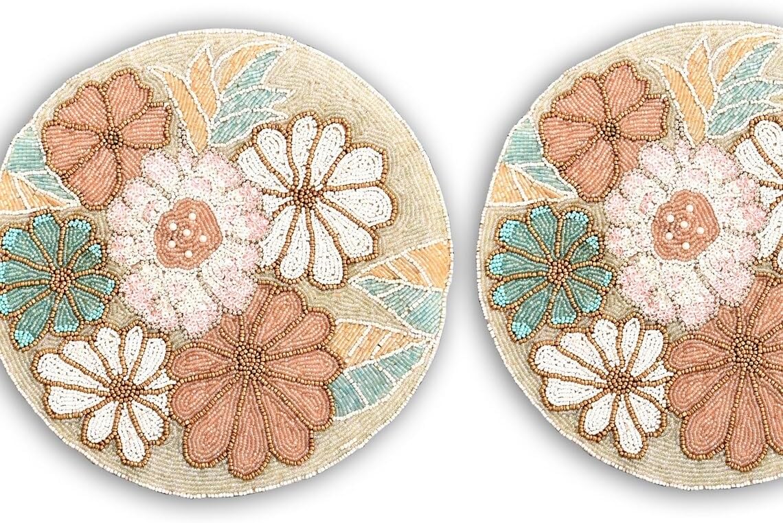 HM CREATIONSAbout placematsGet handmade beaded Table Mats And Placemats for Dining and center table decoration. Oomph up your table decor with the Summer placemats in Leaves look. This hand-embroidered placemat in a set of 2/4/6 forms a perfect Housewarming gift and wedding favors for your friends and family. Delight your guests with spectacular Summer decorations.Set of 2/4/6 Leaves beaded tablemats is a non-slip product that is fade-resistant and continues to look new with passing time. Buy a long-lasting set of 6 hand-embroidered placemats that uniquely define your taste and preference.We at HM Creations believe that Some of the most important conversations ever occurred at family's and Friend's dinner tables. So we would love to make your dinner tables perfect with our hand-beaded table runners, handmade charger plate, and coasters. For all the occasions and festivalsYou will get:Quantity: Set of 2/4/6, depending on your orderSize: 13*13 InchesShape: RoundColor: MulticolorMaterial Used: Beads And Satin FabricCare Instruction: Heat sensitive and water resistant. Please spot-clean with a damp cloth for increased longevity.Weight: 500 Gram