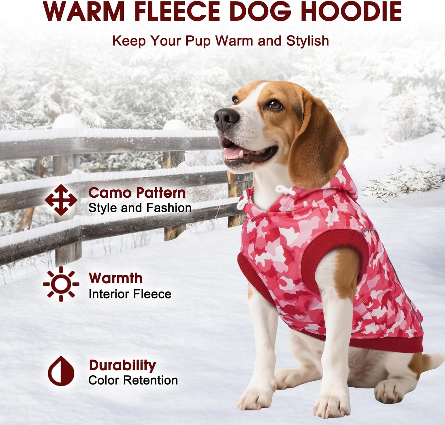IECOii Camo Dog Hoodies Pullover Dogs Sweatshirt Thin Fleece Lining for Gentle Warmth – Soft thin fleece inside locks in just the right warmth for cool days, no overheating. Gentle on your dog’s skin, keeping them comfy during all activities. Stylish Camo Print – Rugged camo design hides light dirt while looking sharp. Fade-resistant print stays vivid even after repeated washes, maintaining a fresh look season after season. Reflective Stripes & Built-In Leash Hole – Bright reflective stripes boost visibility at dusk/night for safety. Back leash hole works with harnesses/collars—no need to remove the hoodie, saving time on walks. Fits Medium to Large Breeds – Available in sizes for medium/large pups (note: not ideal for thick-necked breeds like French Bulldogs). Machine-Washable & Durable – Tough fabric stands up to rough play, scratches, and frequent washes. Easy to clean—just toss in the washer, no tedious care needed for busy pet parents. Perfect for Fall/Winter & Outdoor Activities – Ideal for cool fall/winter weather. Great for hiking, camping, backyard play, or daily walks—keeps your dog warm and protected during outdoor adventures.