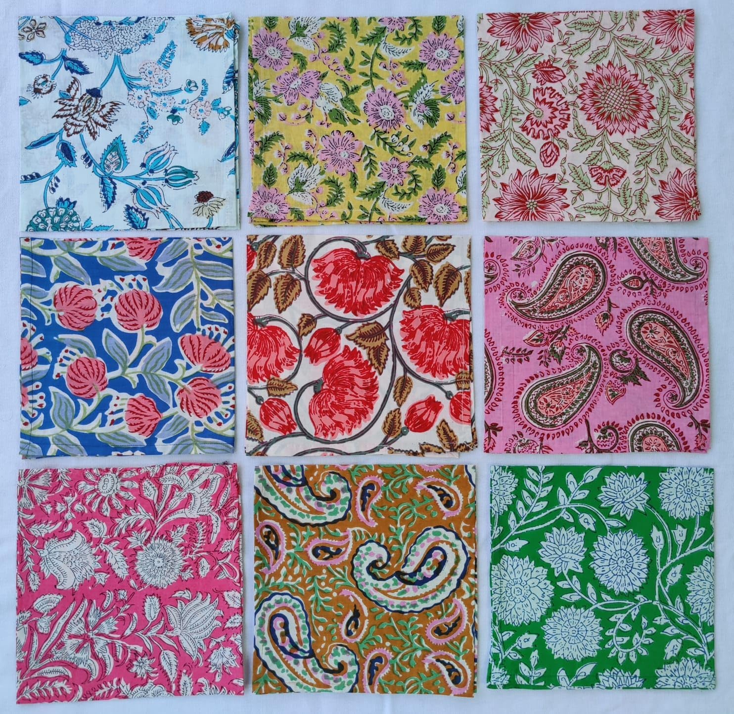 INDIANHANDICRAFTS 10 Pc Mix Lot This beautiful floral-patterned napkins were hand-stamped by local makers in India using traditional techniques. The 100% cotton napkins are approximately 20X20 and should be machine washed cold. The product is a hand-printed textile so there will be naturally occurring dye and pattern variations throughout, making each piece unique. Each napkin has been pre washed and made carefully, with its four hems turned by hand before stitching so that you have a beautiful, long lasting, thoughtfully sewn item
