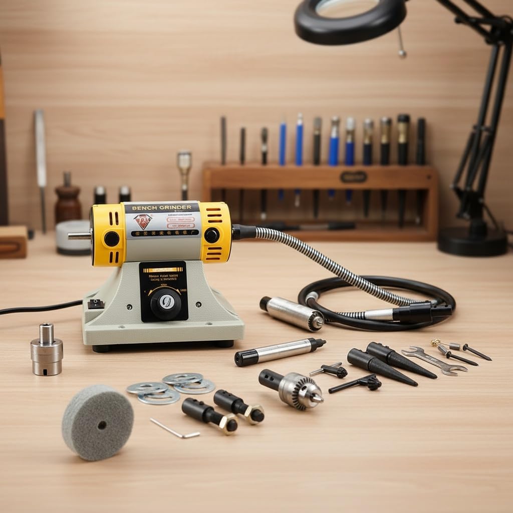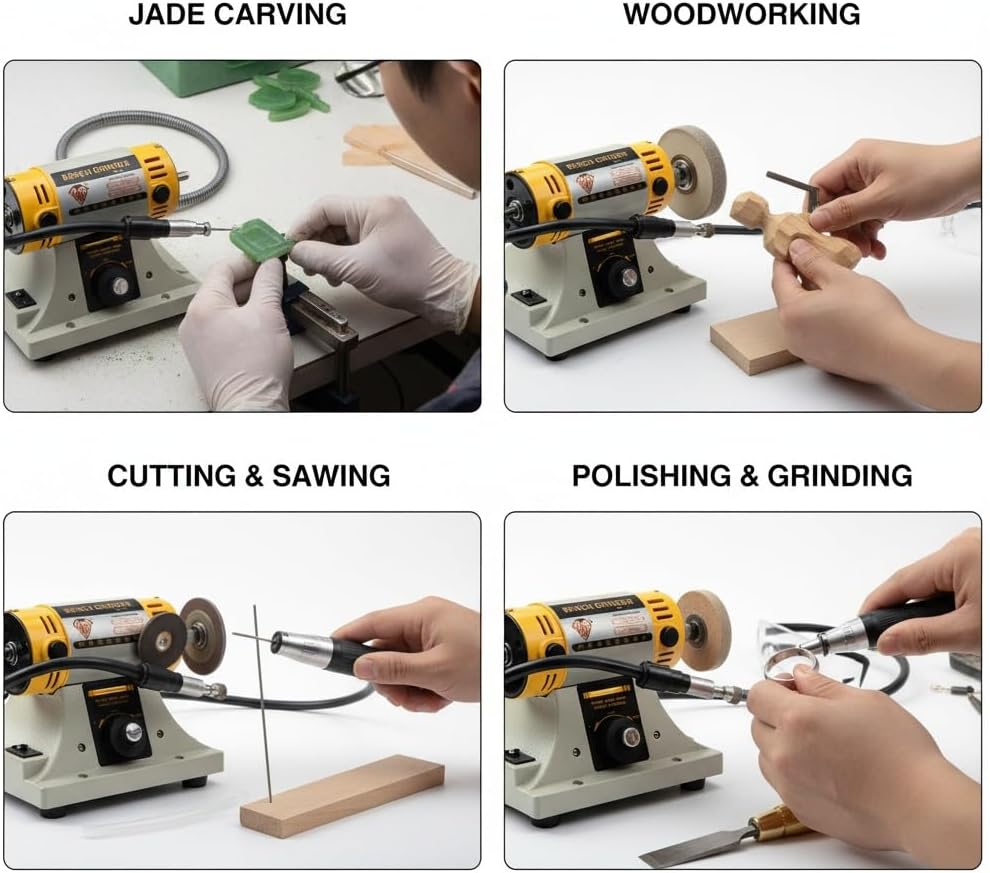 110V 350W Bench Lathe Polisher Jewelry Jade Rock Polishing Buffer MachineFeature1. Variable speed to 10,000 rpm.2. Bench Polisher has pre-lubricated ball bearings and a dust-proof motor housing that makes it virtually maintenance free.3. High quality or speed with this well balanced precision polisher, works with standard wheels and buff pads up to 4 inch.4. This Jewelry Buffer is designed to burnish and polish jewelry metals, stone, glass.5. The two tapered spindles attach to the 1/4" motor shafts and accommodate muslin or buffing/polishing/grinding, cutting wheels up to 4" in diameter.6. Mainly used for all sorts of conceivable operation: milling engraving carving drilling polishing clean derusting and other more use. Suitable for burnish and polish jewelry metals, stone, glass, jade etc.7.Lightweight and small size, easy to use and carry.SpecificationVoltage: 110V 60hzPower: 350WSpeed: 10000r/minPackage included1 Set of Jewelry Rock Polishing Buffer Machine