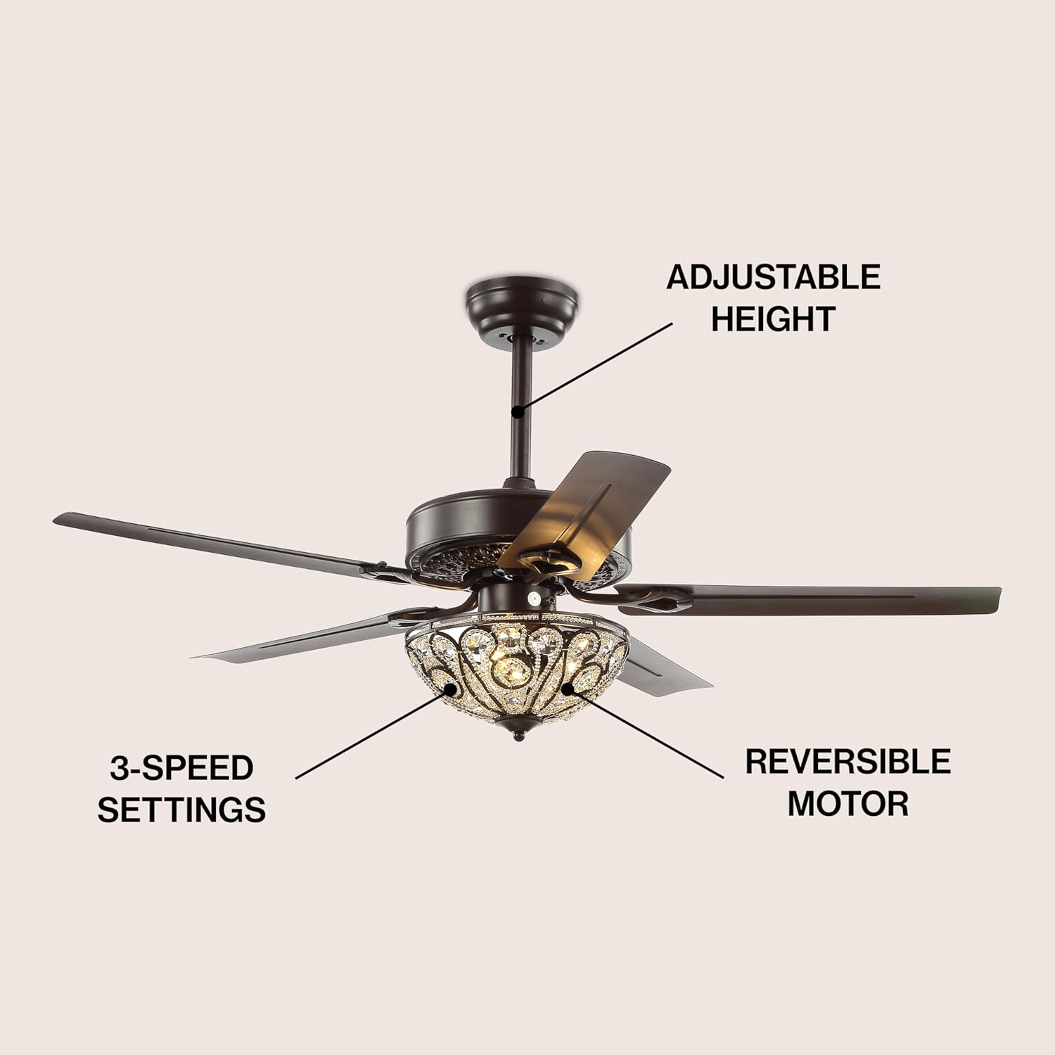 Our 48" Oiled Bronze fan combines rustic style and Old World glamour, featuring an ornate wrought iron dome light embellished with crystal drops. Five reversible blades create plenty of air flow by remote control. Three LED bulbs provide bright, sparkling light.