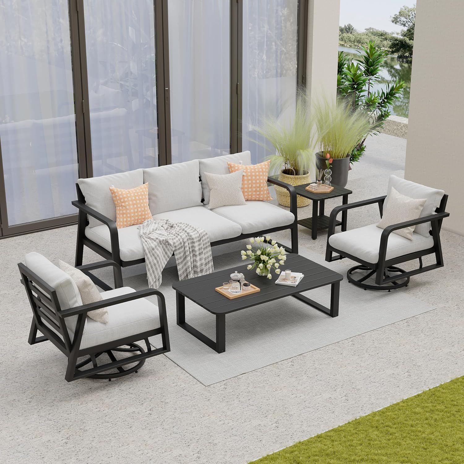 Grand Outdoor Entertaining: Swivel Luxury for the Whole CrewTransform your expansive patio or garden into a sophisticated entertainment destination with the KEIKI 8-Piece Aluminum Conversation Set—the ultimate solution for hosting large gatherings without compromising on comfort or style. This masterfully curated ensemble combines a generous three-seater sofa with four dynamic 360-degree swivel rocking chairs, anchored by a trio of tables including one central coffee table and two side tables. Crafted from premium coated aluminum in sophisticated Dark Grey, this comprehensive configuration offers unparalleled versatility for backyard celebrations, family reunions, or leisurely deck lounging, ensuring every guest enjoys optimal comfort and convenient surface space.Product Specifications:Origin: Engineered with aircraft-grade aluminum alloy standardsMain Material: Powder-coated rust-resistant aluminum frameCushion Material: 4-inch high-resilience memory foam with waterproof, color-fast fabric coversFrame Construction: Reinforced aluminum with precision welding and 360° swivel base mechanismStyle: Modern industrial with minimalist clean linesConfiguration: 1 Three-Seater Sofa + 4 Swivel Rocking Chairs + 1 Coffee Table + 2 Side TablesCushion Inclusion: Yes, zippered removable covers for all seating componentsArmrest/Backrest: Ergonomic proportions with substantial arm supportDimensions & Weight:Three-Seater Sofa Package: 49.21" L x 25.98" W x 12.99" H, 72.42 lbsSwivel Chairs Packages (x2): 27.95" L x 25.98" W x 16.14" H, 36.05 lbs each (4 chairs total)Tables Packages (x2): 27.95" L x 25.98" W x 17.72" H, 47 lbs each (1 coffee table + 2 side tables total)Total Shipping Weight: 229.57 lbs via multi-box delivery systemSofa Seating Capacity: 3 adults comfortablyTotal Seating Capacity: 7 adults (3 on sofa + 4 in chairs)Table Configuration: One large central surface plus two smaller accent tablesKey Features:360-Degree Swivel Rocking Technology: Four independent chairs feature full-circle rotation and gentle rocking motion, allowing guests to adjust their angle without disturbing the conversation flowComprehensive 8-Piece Configuration: Complete entertainment system including substantial sofa, four dynamic seats, and three coordinating tables for maximum serving versatility4-Inch Memory Foam Comfort: High-resilience foam cores provide superior pressure relief and maintain shape integrity through seasons of heavy useAll-Weather Aluminum Construction: Coated metal frames resist oxidation, fading, and corrosion without the weight of steel or maintenance demands of woodTriple Table Setup: Strategic inclusion of coffee table plus dual side tables creates abundant surface area for large gatheringsWeights & Dimensions:Sofa Overall Dimensions: Generous three-person seating with substantial depth for loungingSwivel Chair Dimensions: Ergonomic proportions optimized for rotation clearanceSeat Height: Standard profile for easy entry and exit from both sofa and chairsArmrest Height: Substantial support surfaces for comfortable elbow placement during extended conversationsWeight Capacity: Industrial-grade aluminum supports substantial loads with zero flexAssembly: Required for all components; hardware and detailed instructions includedAdditional Information:Fabric Grade: Premium outdoor textile with water-repellent finish and mildew resistanceFrame Finish: Dark Grey powder-coated aluminum resisting scratches and thermal retentionTabletop Material: Coated aluminum construction matching frame aesthetic for unified appearanceCushion Color: Coordinated Dark Grey to match frame aestheticSwivel Mechanism: Smooth-rotation ball bearing system with rust-resistant coating for each chairMaintenance: Frame cleans with mild soap and water; cushion covers machine washable on gentle cycleRecommended Use: Large residential outdoor spaces, expansive patios, garden terraces, poolside entertaining areas, spacious decksWeather Advisory: All-weather rated for year-round exposure; cushions may be stored during severe weather to maximize longevityEvery rotation of the four KEIKI swivel chairs brings a new perspective to your outdoor gatherings, while the generous three-seater sofa anchors the conversation with cloud-like comfort. The strategic inclusion of not one, but three tables—including a substantial central coffee table and two convenient side tables—eliminates the jostling for surface space that plagues lesser sets, ensuring every guest has room for their refreshment and personal items. Whether hosting a lively backyard barbecue or an intimate garden cocktail hour, this 8-piece Dark Grey ensemble delivers the perfect synthesis of industrial-grade durability and sophisticated modern hospitality, creating an enduring destination for connection and celebration.