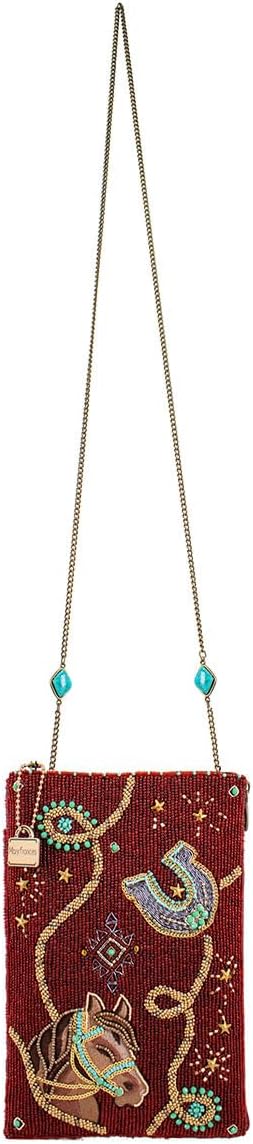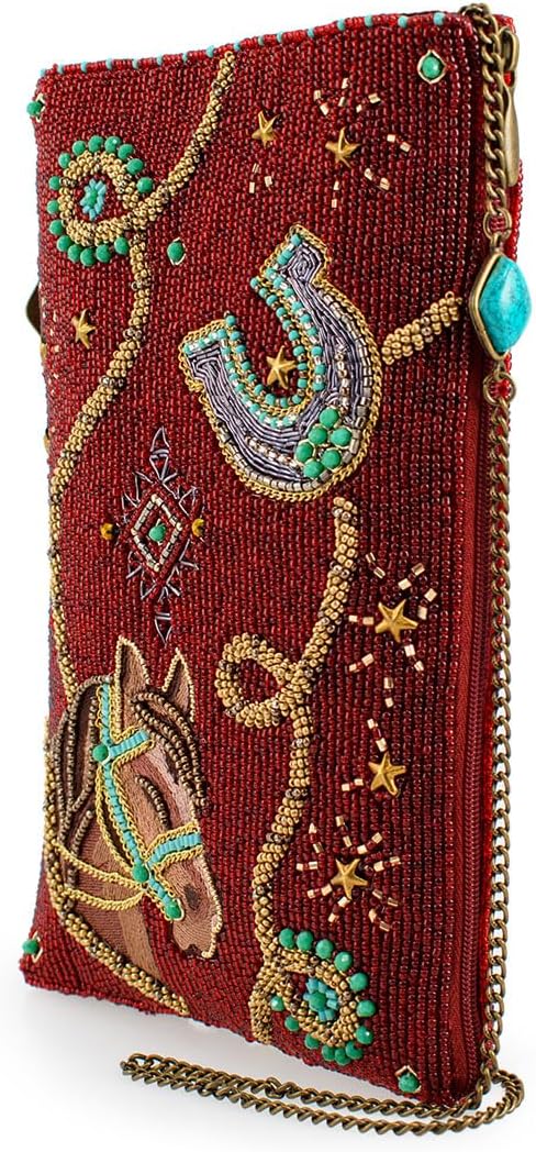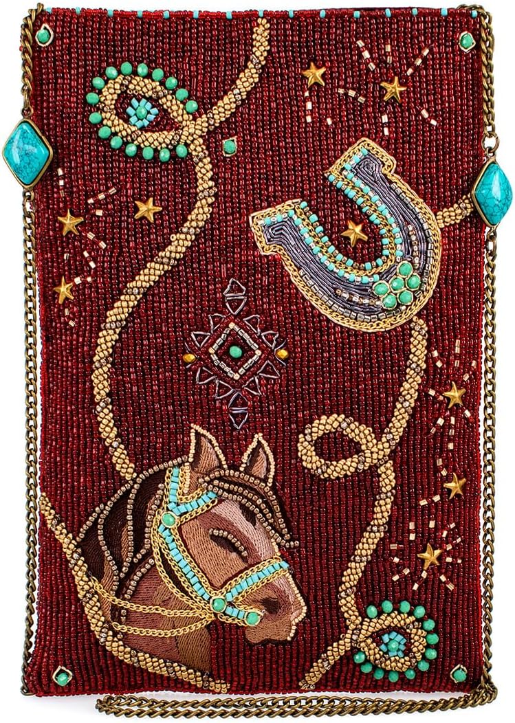 Calling all cowgirls! This is the must-have-mini you've been waiting for. Embellished western icons dance on a deep earthly red background for a playful yet sophisticated look.