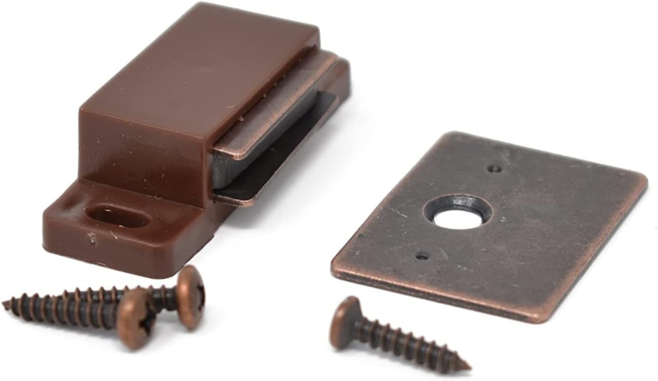 Box of 50 - 15lb Single Magnetic Catches Brown/Bronze Polybagged with 1 Catch, 1 Strike Plate 1 #5x5/8" Flat Head Screw, and 2 #6x3/4" Pan Head Screws Great for shutter and cabinet/furniture doors