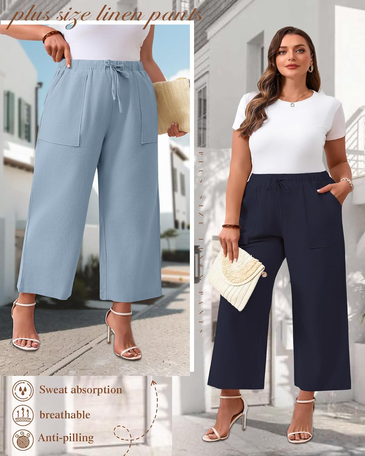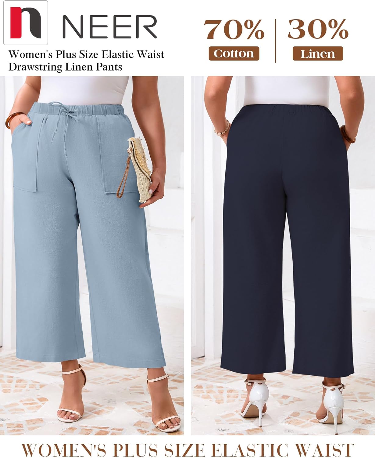 Features: Comfortable and breathable: These women's plus size drawstring linen pants feature a soft breathable linen material, making them suitable for holidays and summer days. Even in the hot and humid weather, you can stay cool and stylish with these beach linen pants. Stylish design: These women's plus size loose palazzo trousers offer the ideal balance between aesthetics and comfort. The high-waisted design beautifully shapes your figure by accentuating your waist, and the wide leg design is suitable for a modern minimalist look. Specifications: Material: 70% Cotton, 30% Linen Package includes: 2 x Women's Plus Size Linen Pants Notes: Manual measurement, please allow slight errors on size. The color may exist a slight difference due to different screen displays. Please wash dark colors separately, and bleaching is not allowed.