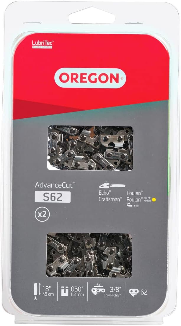 Designed for homeowners and occasional chainsaw users, the Oregon S62 AdvanceCut Saw Chain is a low-vibration, low-kickback chain featuring Chamfer Chisel cutters with twin cutting corners for outstanding performance. This 18", 3/8" Low-Profile chain fits saws from many manufacturers including Husqvarna, Jonsered, Makita, Echo and Ryobi. Contact Oregon Customer Care to find the best fit for your chainsaw. Fits many models, including but not limited to the following: Craftsman/Sears 316. 38090, 358. 34118, 358. 34190, 358. 35038, 358. 35048, 358. 35088, 358. 35099, 358. 35161, 358. 35170, 358. 35190, 358. 35216, 358. 36026, 358. 36218. Echo CS-352, CS-346, CS-370, CS-400, CS-2800, CS-2900, CS-3000, CS-3400, CS-3450. Homelite 23AV, 3300, UT10580, UT10580, UT10588, UT10589, UT10680. Husqvarna 136*, 137*, 235E*, 240*, 240E*, 334T, 335XPT, 338XPT* (*Ensure your model has a 3/8” low profile sprocket). Kobalt KCS180B-06. McCulloch CS340, CS380, EB 358a, MC4218AV, MCC1840B, MS354a, MS 354a, MS 4018, MXC1840D. Poulan 260, 400E, 1950, 2050, 2055, 2075, 2150, 2175, 2300, 2375, 3816, 4018, 4218, 4218A, 4218AVX. Remington 111174-01, CLD4018AW, CLD4018AWC, LD4018AW, LD4018WC, RM1840W, RM4218.
