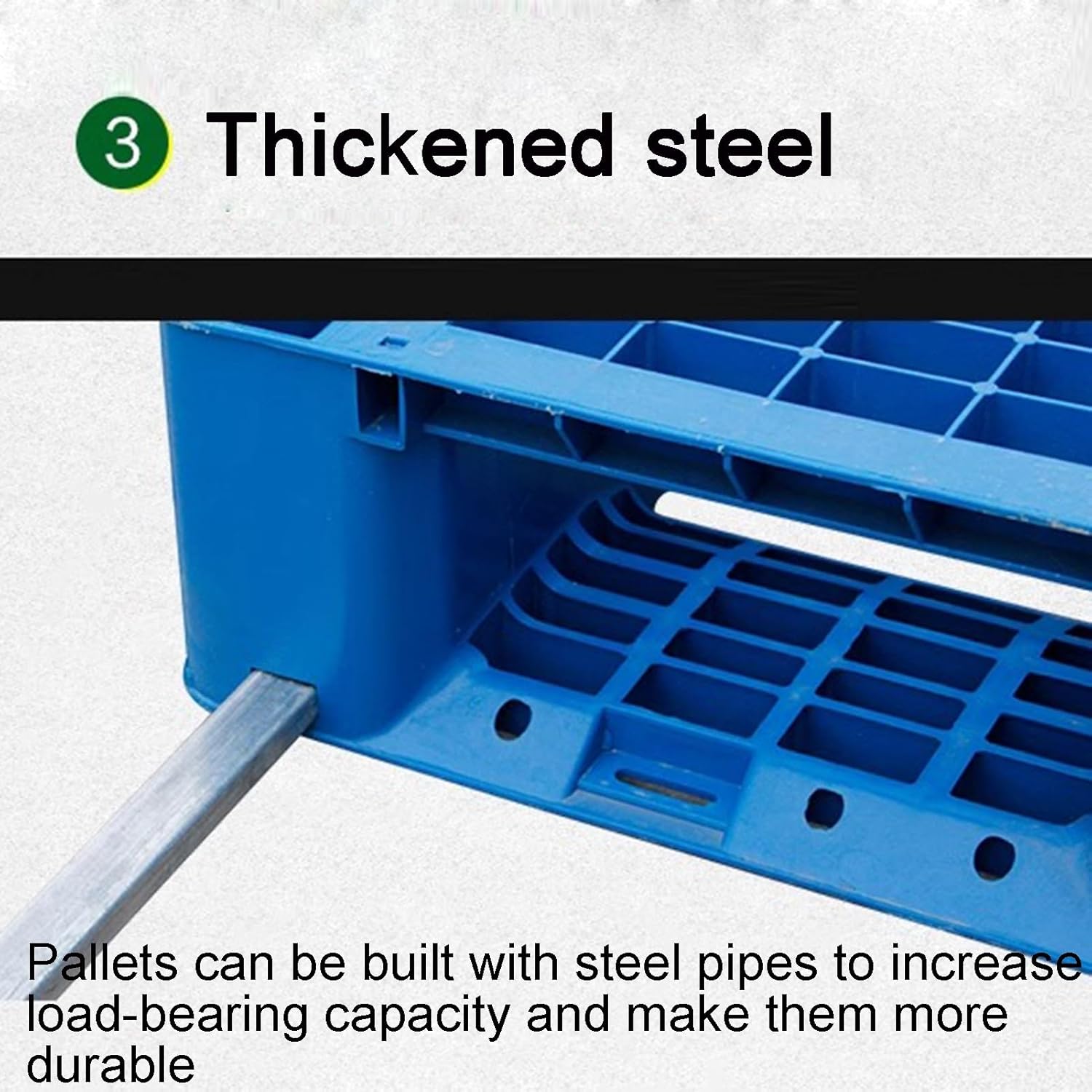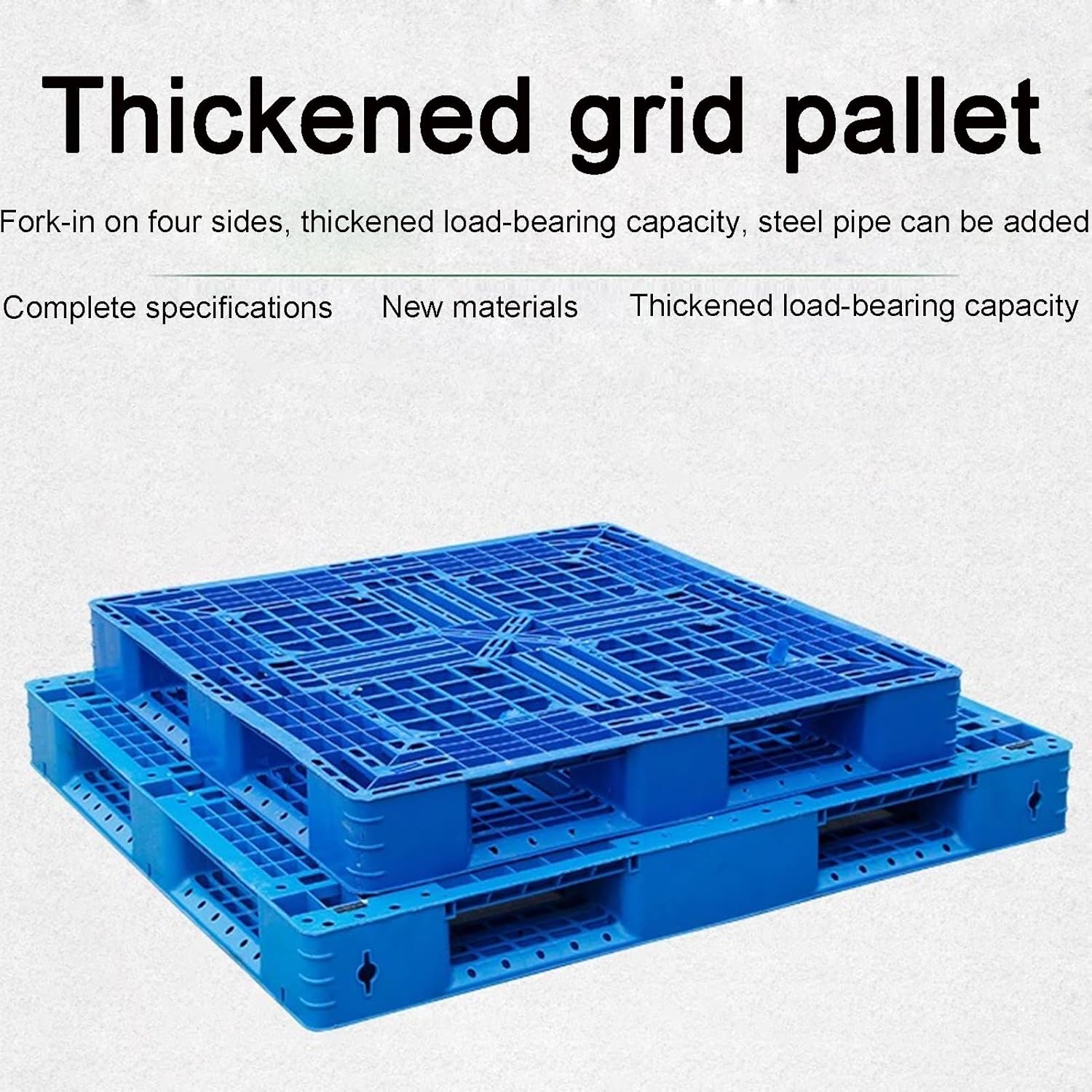 Product Features:Type A is the regular typeType B is the steel pipe type with higher load bearing capacity1. Storage in plastic pallet pile, save space and rational use.2. This is very useful to avoid collision and damage during haulingSpecificationName: plastic palletMaterial: high-density polyethyleneColor:BlueSize:60x80cm100x100cm110x110cm120x80cm120x100cm120x110cm120x120cmPacking list:Plastic tray x 1Caution:Please choose your size before you buy