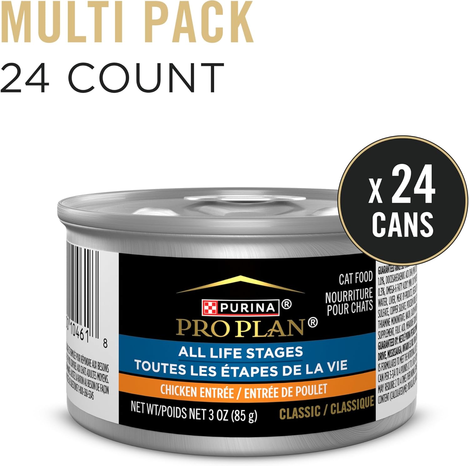 Purina Pro Plan High Protein Wet Cat Food All Life Stages Chicken Pate Classic Entree offers suitable taste, great texture, and full nutrition for a multi-cat household across different life stages. This pate cat food formula is the option you’ve been looking for. It’s made with real chicken as the first ingredient to provide the optimal protein level and maintaining the ideal body condition of all your cats. Purina Pro Plan High Protein Wet Cat Food All Life Stages Chicken Pate Classic Entree contains DHA for brain and vision development, antioxidants for cat’s immune support, and omega-6 fatty acids to nourish the skin and coat, and vitamin A and taurine for healthy vision. This Purina Pro Plan wet cat food is easy to serve and offers balanced nutrition that supports cats of all ages, and it’s recommended by veterinarians for multi-cat households. No artificial flavors or colors.