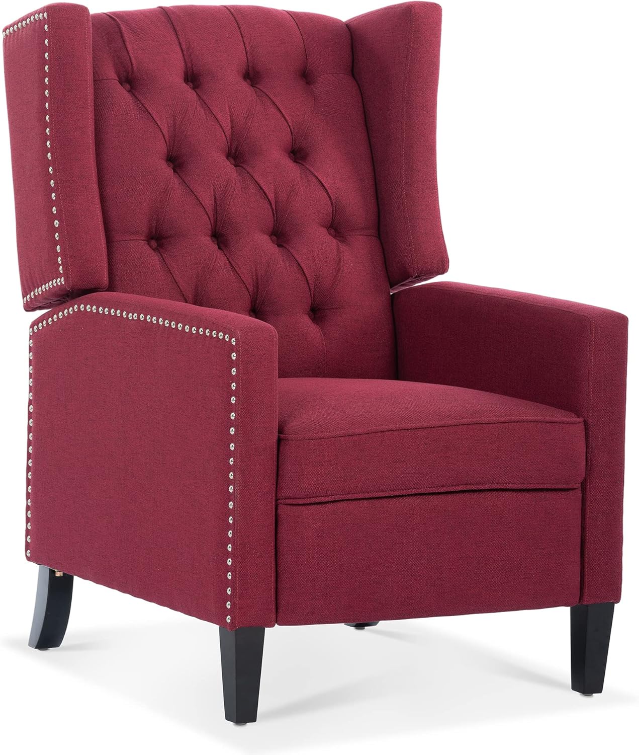 Main Features: 1.Relax and recline after a long day in this recliner. It's built on a solid wood frame and features tufted-button and a rivet decoration for a classic look that works in most styles of spaces. 2.Retractable Footrest: Adjusted from 90°- 160°, meets all your needs, perfect relaxation. 3.This ergonomic chair can give you strong support for your whole body. The cushion backrest provides you with great comfort. What’s more, by placing your hands or arms on comfortable armrests and your feet on the ottoman, you will reduce fatigue. 4.Inspired by modern design, This sofa chair feels more elegant than others, it is a good choice to try. Weight & Dimensions: Overall Dimension: 34.45''D x 27.16”W x 40.55''H Product Weight: 64 lb Seat Length: 20.08"" Seat Depth: 23.03"" Seat Hight: 18.5"" Cushion thickness: 4.72"" Detail Dimension: Please refer to the image Package Number: 1 Package Weight: 72.75 lb Weight Capacity: 220 lbs Specifications: Product Type: Reliner Chair Color: Wine Red Upholstery Material: Polyester Frame Material: Solid Wood + Plywood Leg Material: Birch Seat Construction: ""S""Spring+Foam Adjustable Backrest: Yes Assembly Required: yes Product Care: Spot Wipes Clean with a Soft, Dry Cloth Notes: -Manual measurement has been used, there may be some reasonable error. -All the pictures are taken by actual samples, slight chromatic aberration may occur due to lighting or display.