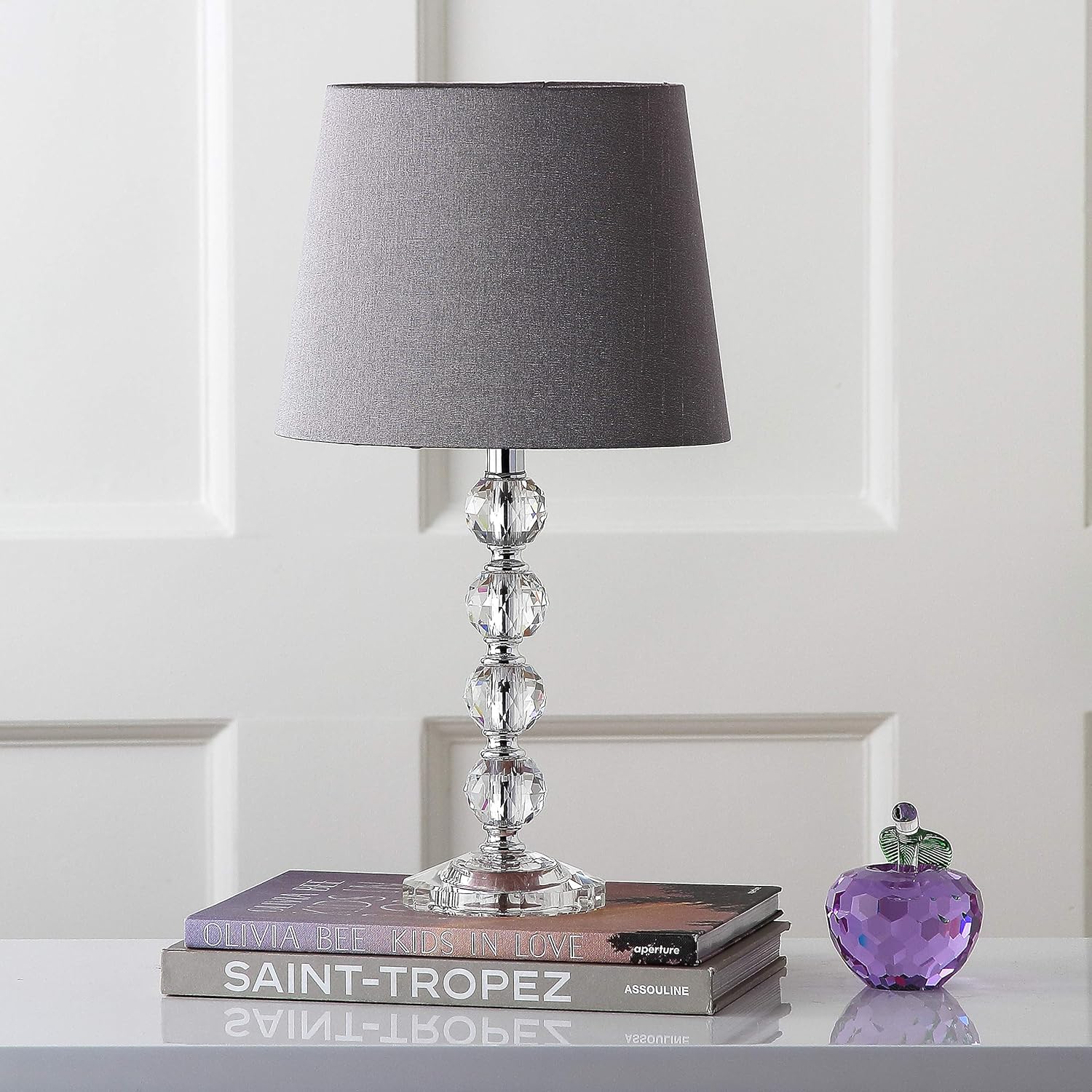 Artful faceting adds glamorous brilliance to any room the elegant Nola stacked crystal ball table lamp inhabits. Crafted in the traditional style of European glassmakers, the crystal looks fresh and new in its arrangement and design. An updated round charcoal gray Geneva shade completes the look.