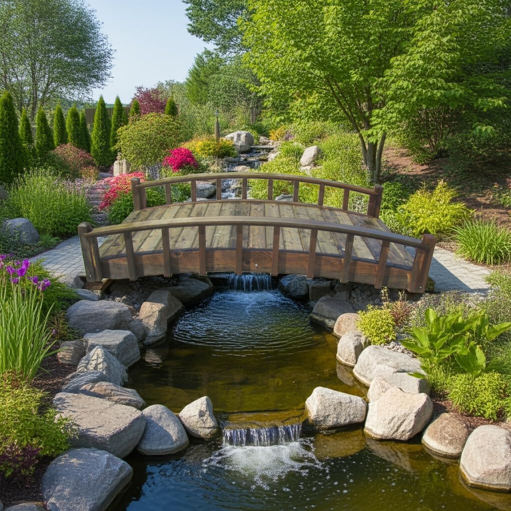 Our gracefully arched wood garden bridges blend into any landscape Theme, highlight your water features & rock gardens, adding a spirit-nurturing aspect to your garden. It spansup to 54". Made of North American Douglas fir, spruce, & pine, With durable construction of custom quality. Easy assembly. Maximum 250 lb. Capacity. Residential use only.