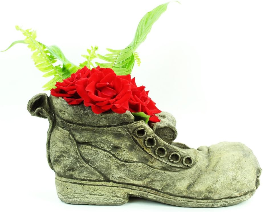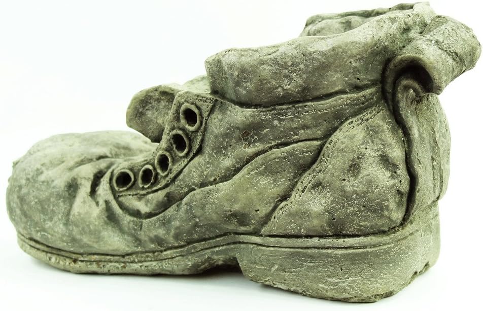 This Shoe planter and each one of our concrete Garden Statues are handmade in the USA, using our secret poured concrete formula so each piece resists all weather climates. Our craftsman use acid stain formulas to bring our cement statuary to life with unique colors like this Gnome Shoe planter.