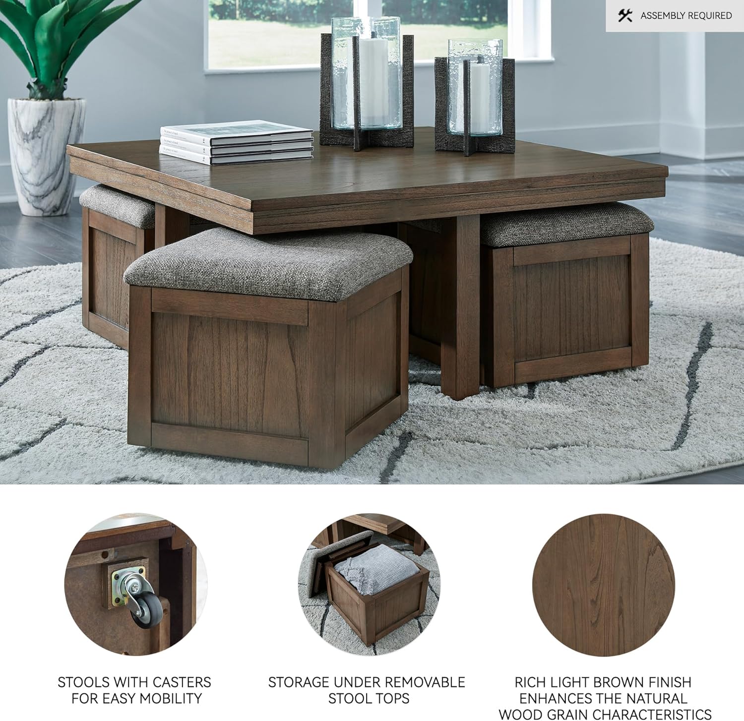 Elevate your entertainment experience with this coffee table with stools. A functional companion for your seating area, it’s defined by a richly versatile finish. Instantly upgrade game days and movie nights—the four stools wheel out easily with casters, tucking away neatly under the table when you’re done. And with storage under the top of each stool, you can keep essentials on hand and out of sight. Signature Design by Ashley is a registered trademark of Ashley Furniture Industries, Inc.