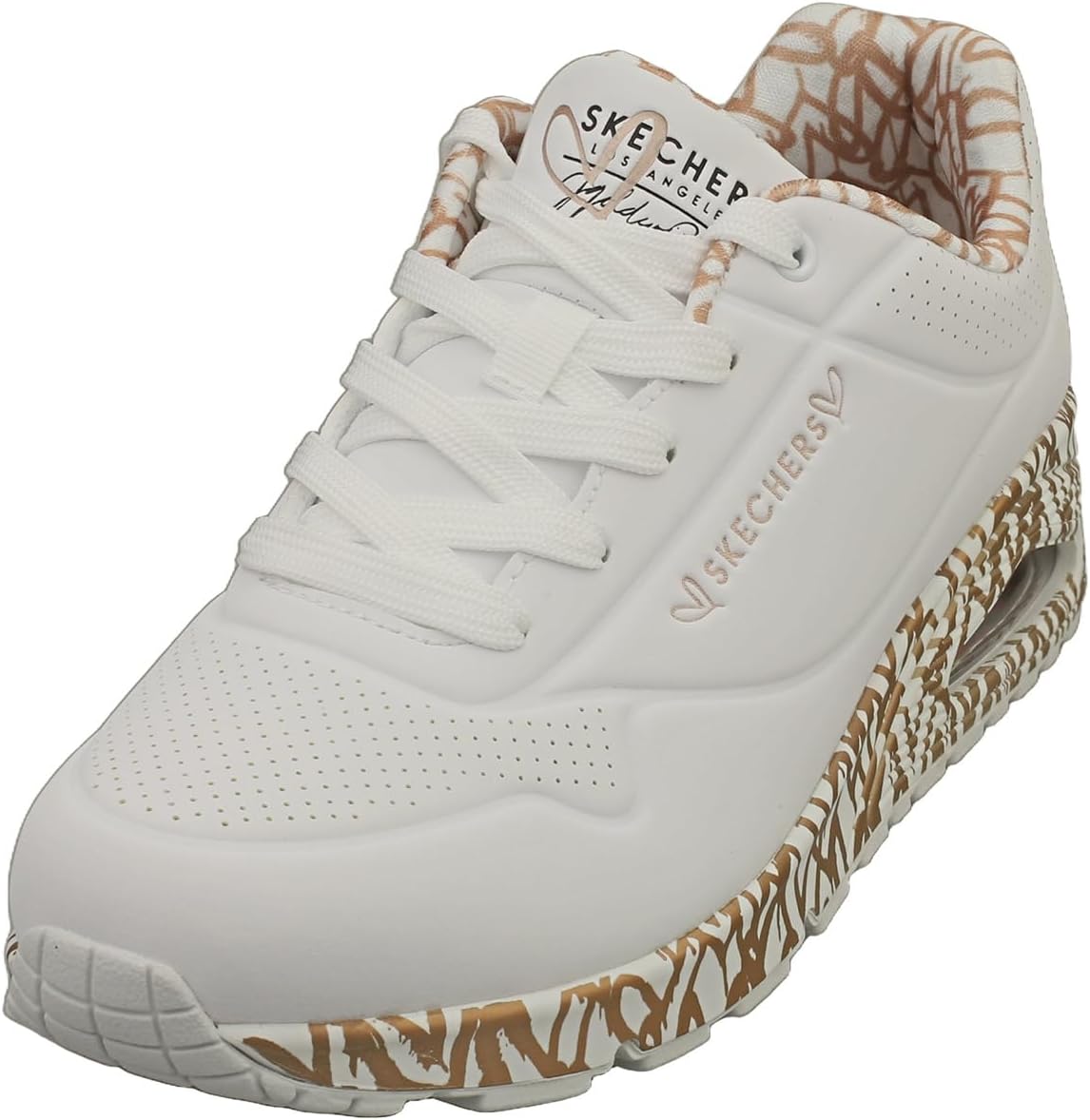 Internationally renowned muralist James Goldcrown brings his iconic #Lovewall heart designs to Skechers in this inspiring collaboration. Walk with 'Love' wherever you go in the Skechers x JGoldcrown: Skechers Street Uno - Loving Love. This lace-up fashion sneaker features the artist's signature heart print trim, synthetic durabuck and perforated trimmed upper with a Skechers Air-Cooled Memory Foam insole, and a platform wedge with visible Skech-Air airbag midsole.