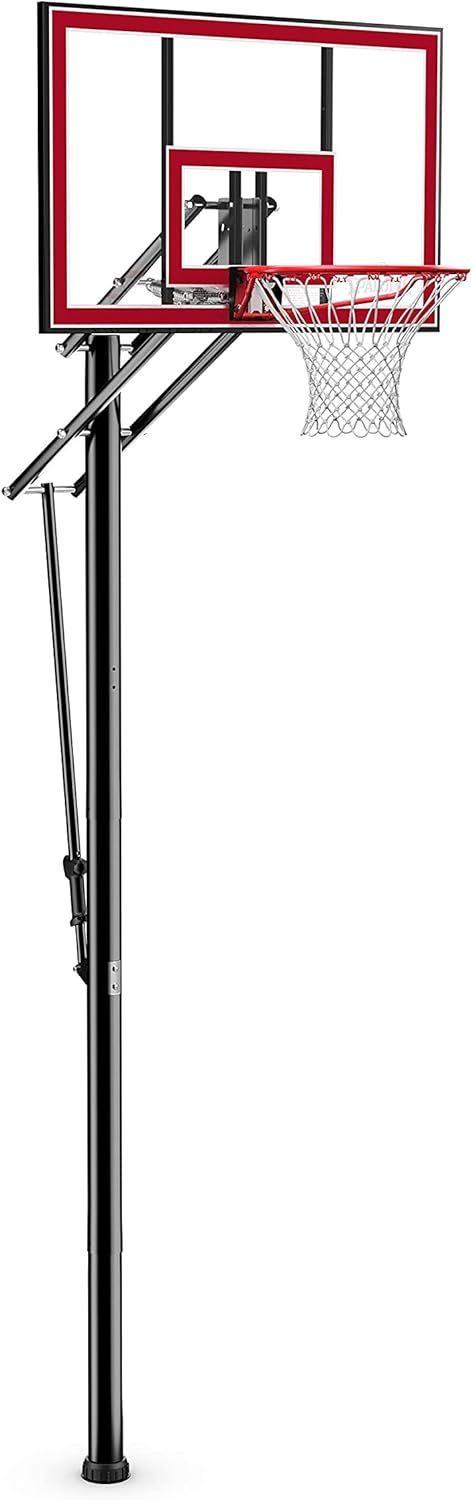 The court is a classroom, a sanctuary and a stage on which to leave your mark. This in-ground hoop system brings the arena to your driveway. It has a sturdy steel rim that's spring-loaded for a smooth breakaway. The clear backboard has a 16" offset so you can play underneath the hoop, and it's made of durable polycarbonate for a good rebound. With the Pro Glide® Lite lift, you can adjust the height of the rim from 8 feet to the regulation 10 feet in 6" increments.