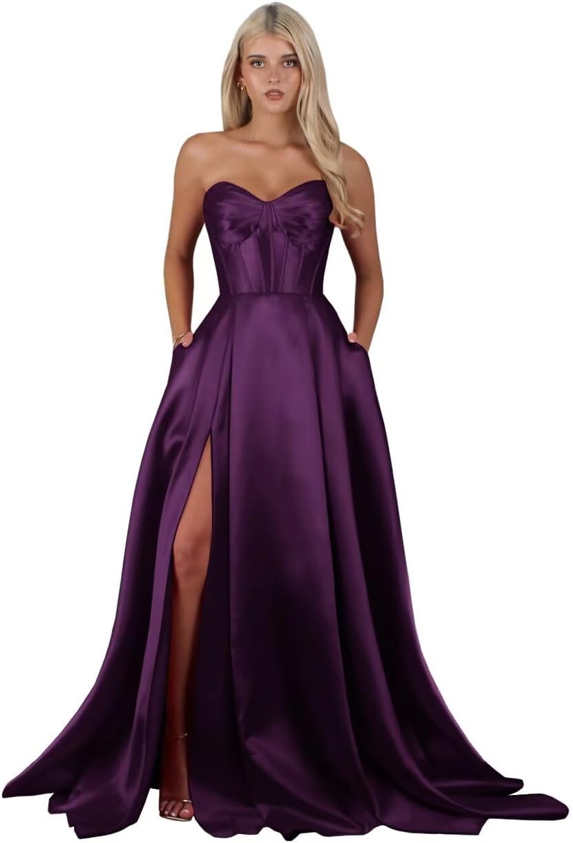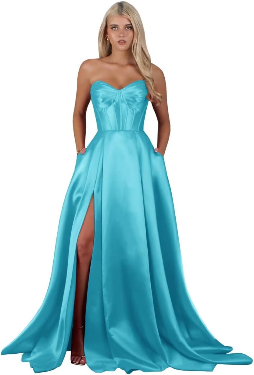 | Fabric Type | Long Satin Strapless Slit A Line Prom Dress with Pockets |