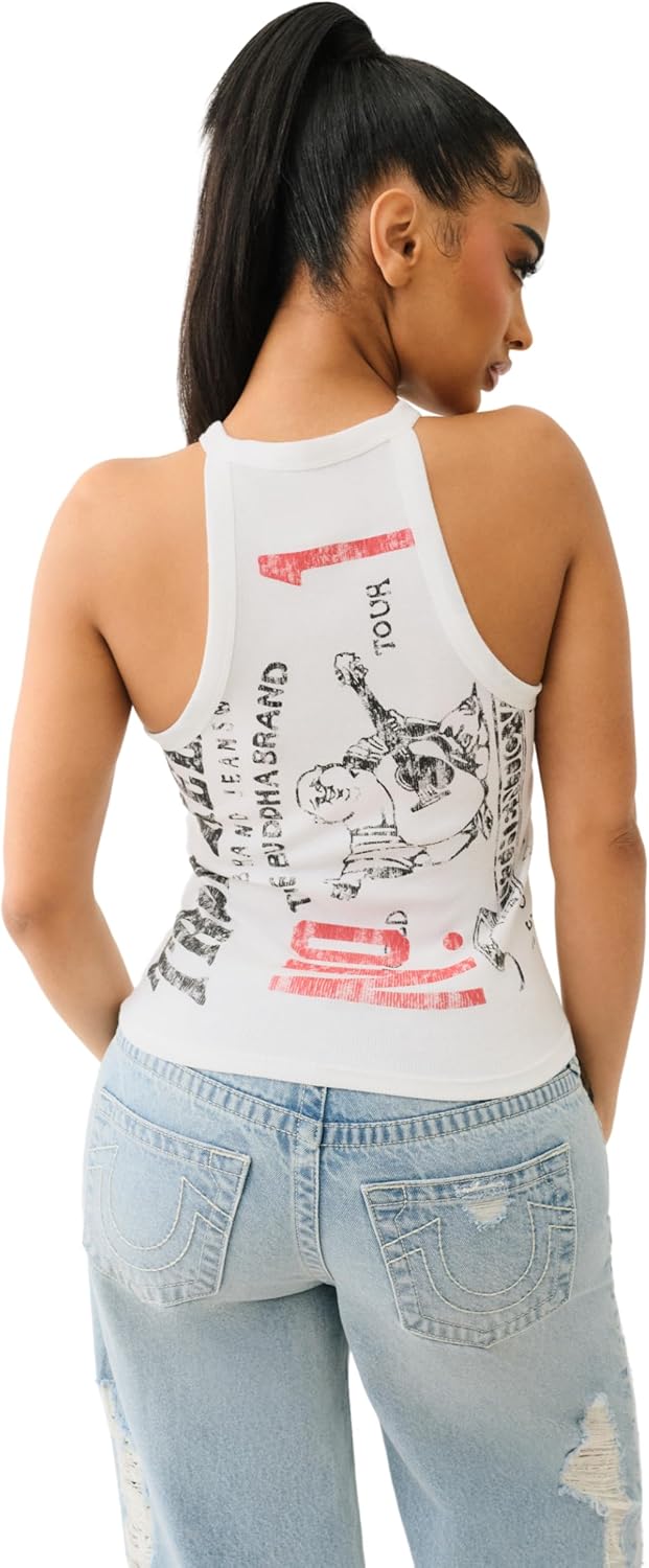 True Religion Women's OG Logo Halter Tank, a stylish and effortless essential. Designed with a sleek halter neckline, this sleeveless top offers a modern, flattering fit that highlights your shoulders and adds a touch of sporty-chic style.Crafted from soft, breathable fabric, this tank provides all-day comfort, making it perfect for warm-weather wear or layering under a jacket. The iconic True Religion OG logo on the front adds a bold, authentic finish, giving your outfit a signature designer touch. Whether paired with denim shorts, joggers, or layered under a blazer, this tank is the perfect mix of versatility and style.Brand: True ReligionStyle: Halter Tank TopMaterial: Soft, breathable fabric (lightweight and comfortable)Fit: Slim, form-fitting silhouette for a flattering lookNeckline: Halter neckline for a modern, stylish touchSleeves: Sleeveless design, perfect for warm weather or layeringOccasion: Ideal for casual outings, gym wear, layering, or streetwear-inspired looksCare Instructions: Machine washable; follow care label for best resultsPattern: Solid color with logo detailingKey Features:Flattering Halter Neckline – Modern and stylish cut that highlights the shoulders.Soft & Breathable Fabric – Lightweight and comfortable for all-day wear.Iconic OG Logo – Signature True Religion branding for an authentic, standout look.Sleeveless Design – Perfect for warm weather or layering under a jacket.Versatile Styling – Pairs effortlessly with jeans, skirts, or joggers for a casual or sporty-chic look.Add a bold yet effortless touch to your outfit with the True Religion OG Logo Halter Tank, the perfect mix of comfort, fashion, and signature branding.