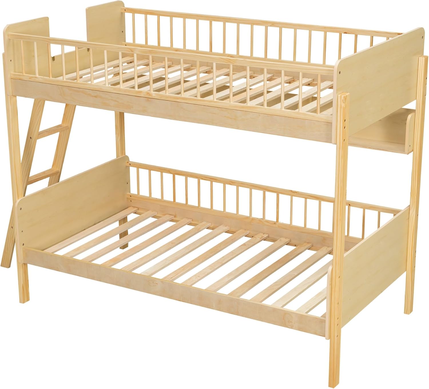 Introducing our bunk beds twin over twin, a perfect blend of style and functionality for your kids' bedroom! This twin over twin bunk bed with storage is designed to save space while offering a sleek, classic aesthetic. Crafted from durable solid wood and MDF, it is available in a variety of crisp finishes to match any decor. The elegant panel-style headboard and footboard add a touch of sophistication. Safety is a top priority, and this twin bunk beds with storage comes equipped with a sturdy ladder that can be placed on either the left or right side, along with guardrails for added security. The included slat kit eliminates the need for box springs, making it easy to set up with two standard twin mattresses (sold separately). With three storage shelves, you can keep books, toys, and other essentials organized, creating a tidy space for your children. Transform their bedroom into a cozy, stylish retreat with our bunk bed twin over twin with storage—where comfort meets practicality! Make the smart choice for your family today. Description Material: Solid wood, MDF Size: Twin over Twin Color: White/Natural Numbers of Package: 2 Spring Box: No need Assembly Required: Yes Origin: Vietnam Overall Product Dimension: 94.5''L x 42.5''W x 63.7''H Each Bed Dimension: 75.2''x 39.3'' Total Height: 63.7’' Recommend Mattress Thickness of Each Bed: 4-6'' Overall Product Weight: 145lbs Each Bed Weight Capacity: 400lbs