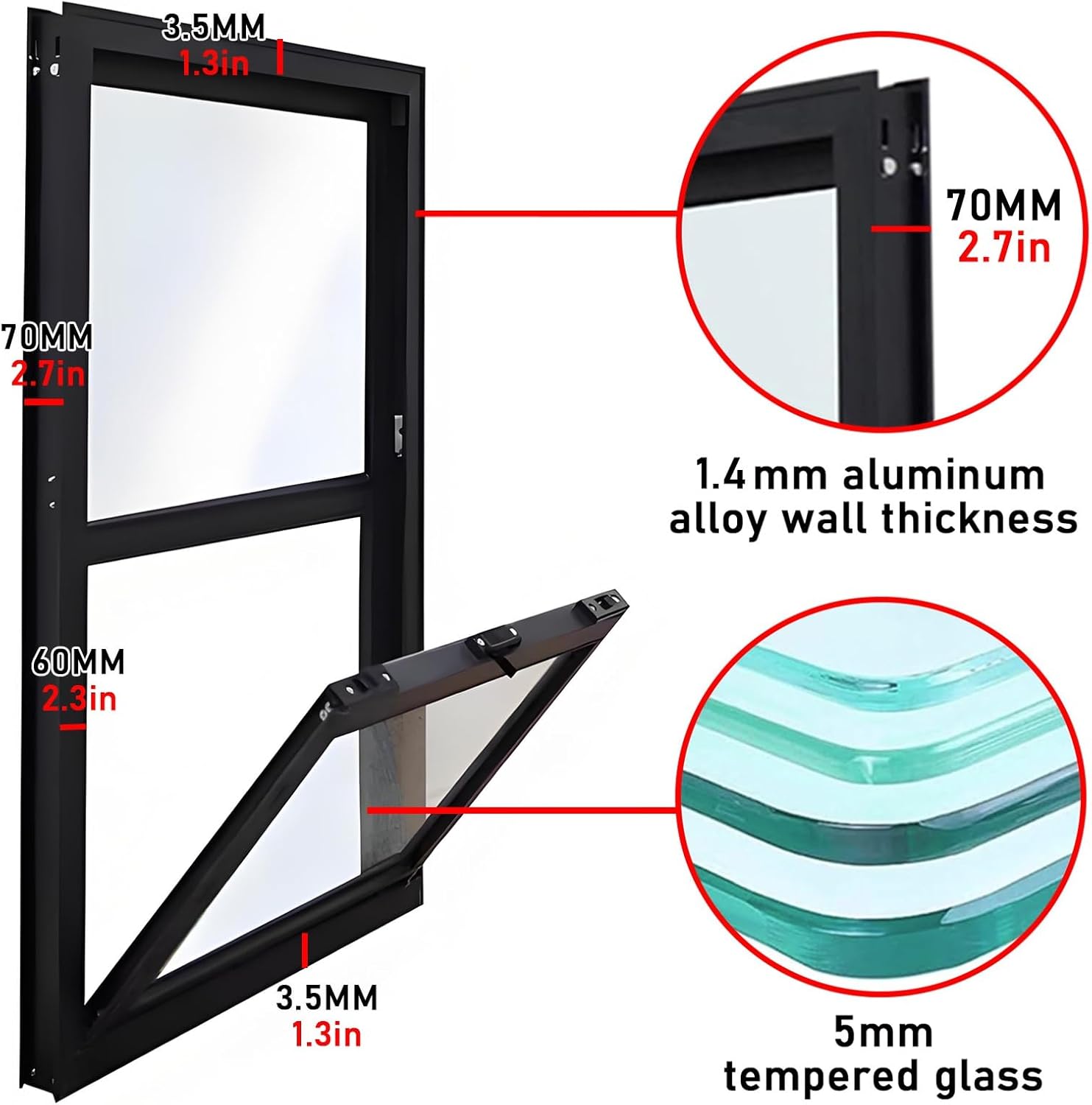 Thank you for visiting YVYKFZD store:* Secure and lockable design with a secure locking mechanism, the serving window offers added safety and privacy. It’s a great choice for locking ventilation windows or home bathroom windows with locks and screens to keep your space safe* Not only do our chicken coop windows allow fresh air to circulate inside, they also protect against wind and rain, improve the appearance of outdoor architecture, and enhance the beauty of your houseSpecification:- Name: Basement Windows/Concession Window/Concession Stand Serving Window Door /Food Truck Serving Window /Shed Window /Shed Transom Window /Single Hung Shed Windows /Flush Mount Window/Mobile Home Window- Material: 1.4mm aluminum alloy frame + 5mm tempered glass(Single-layer glass)- Window frame color: white, gray, black, brown(Customizable)- Width: Customizable- Height: Customizable- Sliding Window Mode: upper part fixed, lower part sliding(Adjustable to upper part sliding , lower part fixed, Please contact me)Package Includes:1×Food Truck Serving WindowWarm Tips- Please wear gloves during installation to avoid scratches- This product is manually measured, there may be an error of 0 ~ 1 cm ( 0 ~ 3/8" )- Due to shooting angle, light, angle of view, etc, it is inevitable that there will be slight errors and color differences, please refer to the actual product