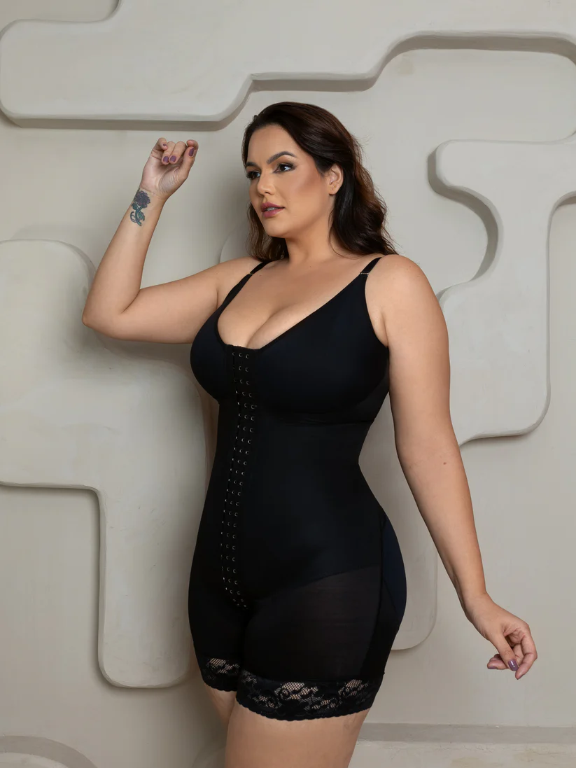 O Macacão Charlote Alça Fina é produzido com a avançada tecnologia Emana, que além de modelar, estimula a produção de elastina, cuidando da sua pele. Com tecido em tela de alta compressão, ele reduz medidas em até 3 manequins e possui detalhes em renda com duplo silicone, garantindo firmeza e elegância. Além de empinar o bumbum, promove drenagem, sendo perfeito para valorizar suas curvas com total conforto. As alças finas dão um toque delicado, ideal para usar por baixo de qualquer look.